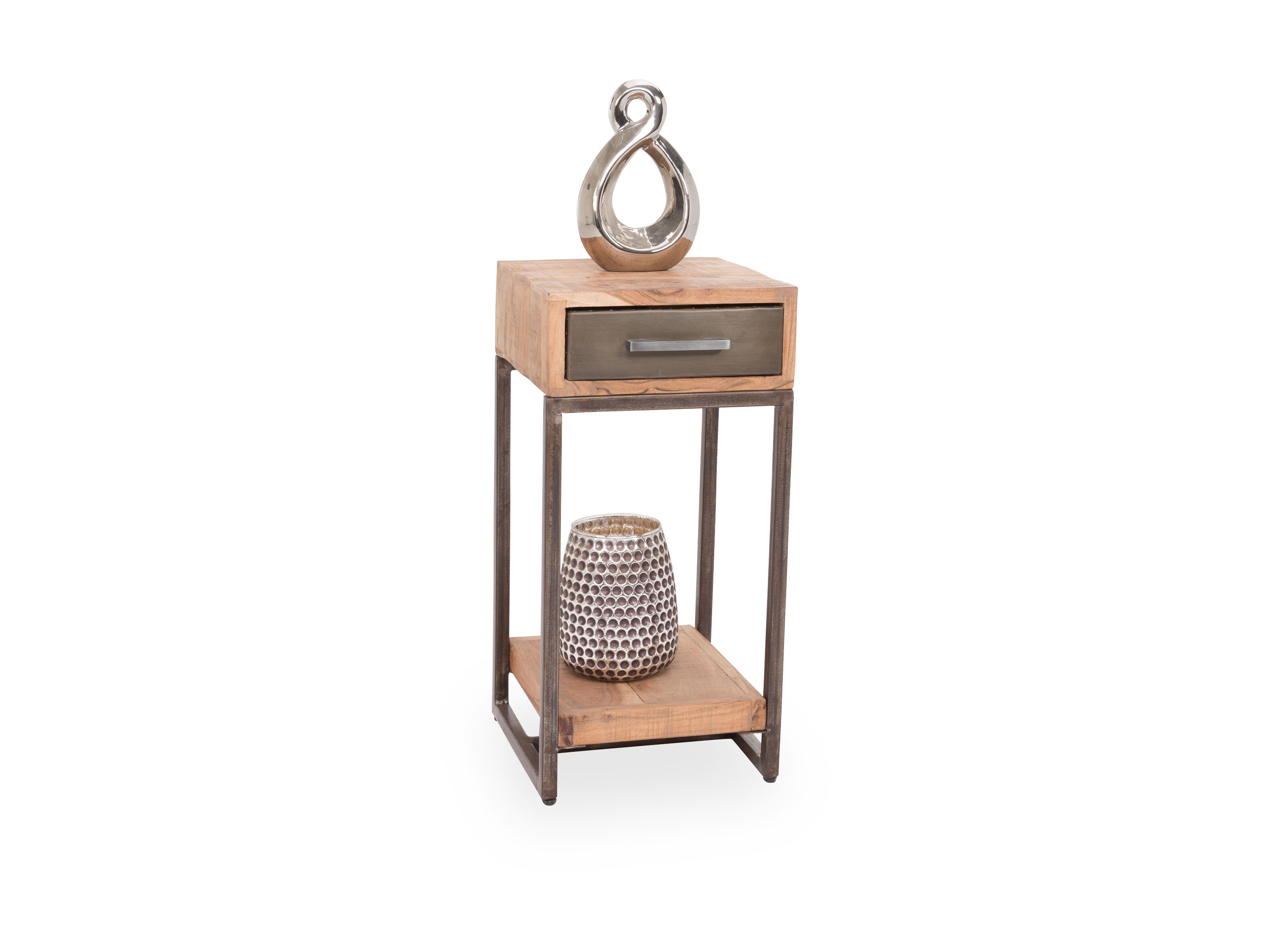 Beistelltisch STYLO überzeugt mit einem geschmackvollen, natürlichen Look im Wohnbereich. Das Element besteht aus massiver Akazie Hela und weist eine schöne Holzmaserung auf. Abgerundet wird der Tisch durch ein Metallgestell, das für ausreichend Stabilität sorgt. Der Tisch mit einer Ablage und einer Schublade ist eine praktische Ergänzung im Wohnbereich und bietet einen Platz für Pflanzen, Deko und viele weitere Kleinigkeiten.
