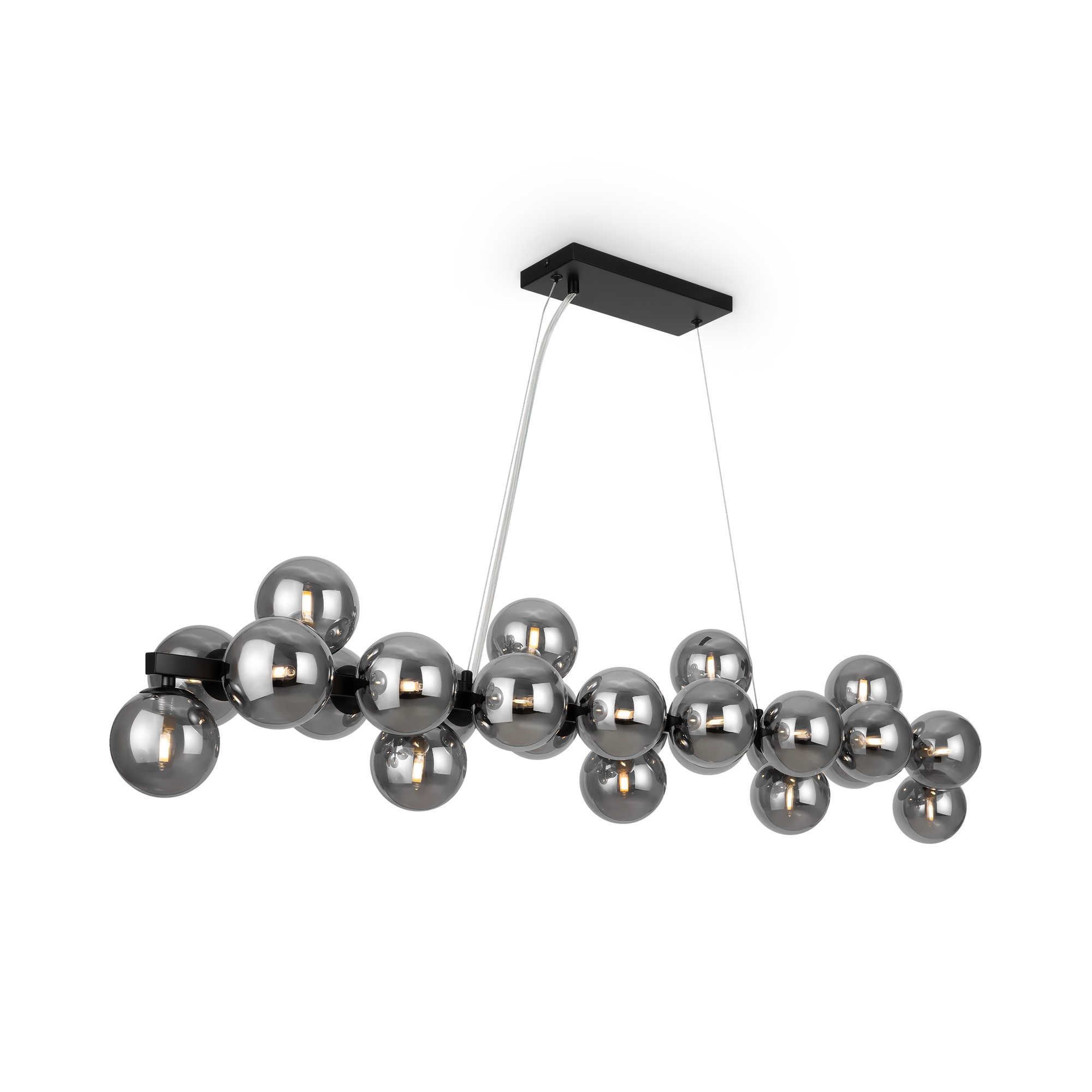 · Metallbeschläge in 4 Farbtönen: Mattes Schwarz, Schwarz, Chrom, Gold. Lampenschirme: Geblasenes Glas. Farbtöne: Rauch, Bernstein, Cognac, Mattes Weiß und Schwarz. Design mit Nachahmung der Molekularstruktur. Durch Seile einstellbare Höhe der Pendelleuchten. Leuchtmittel mit einer Fassung G9.