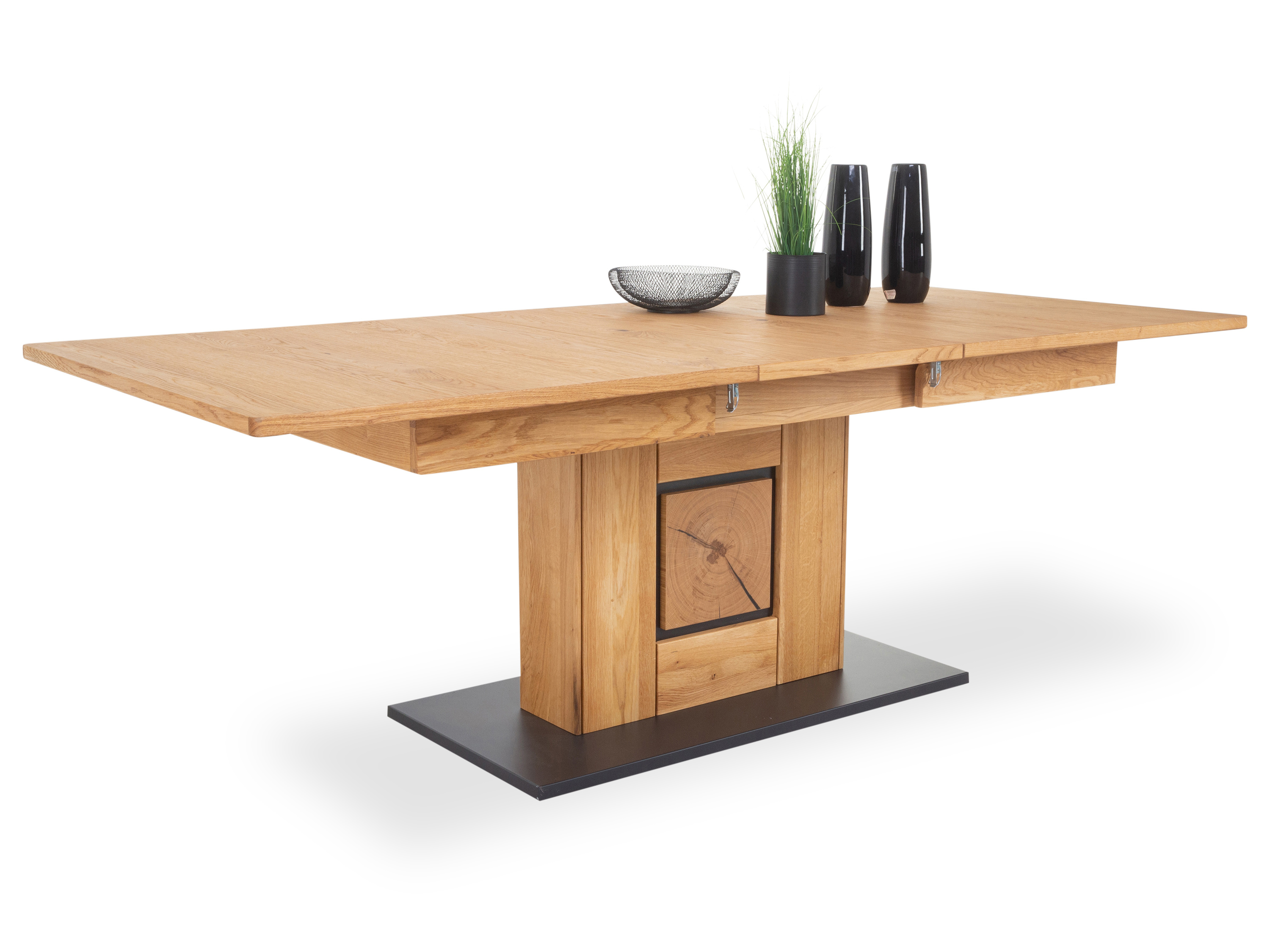 · mit einer innenliegenden Einlege- platte à 50 cm, mit Synchronauszug ausziehbar auf ca. 230 x 100 cm