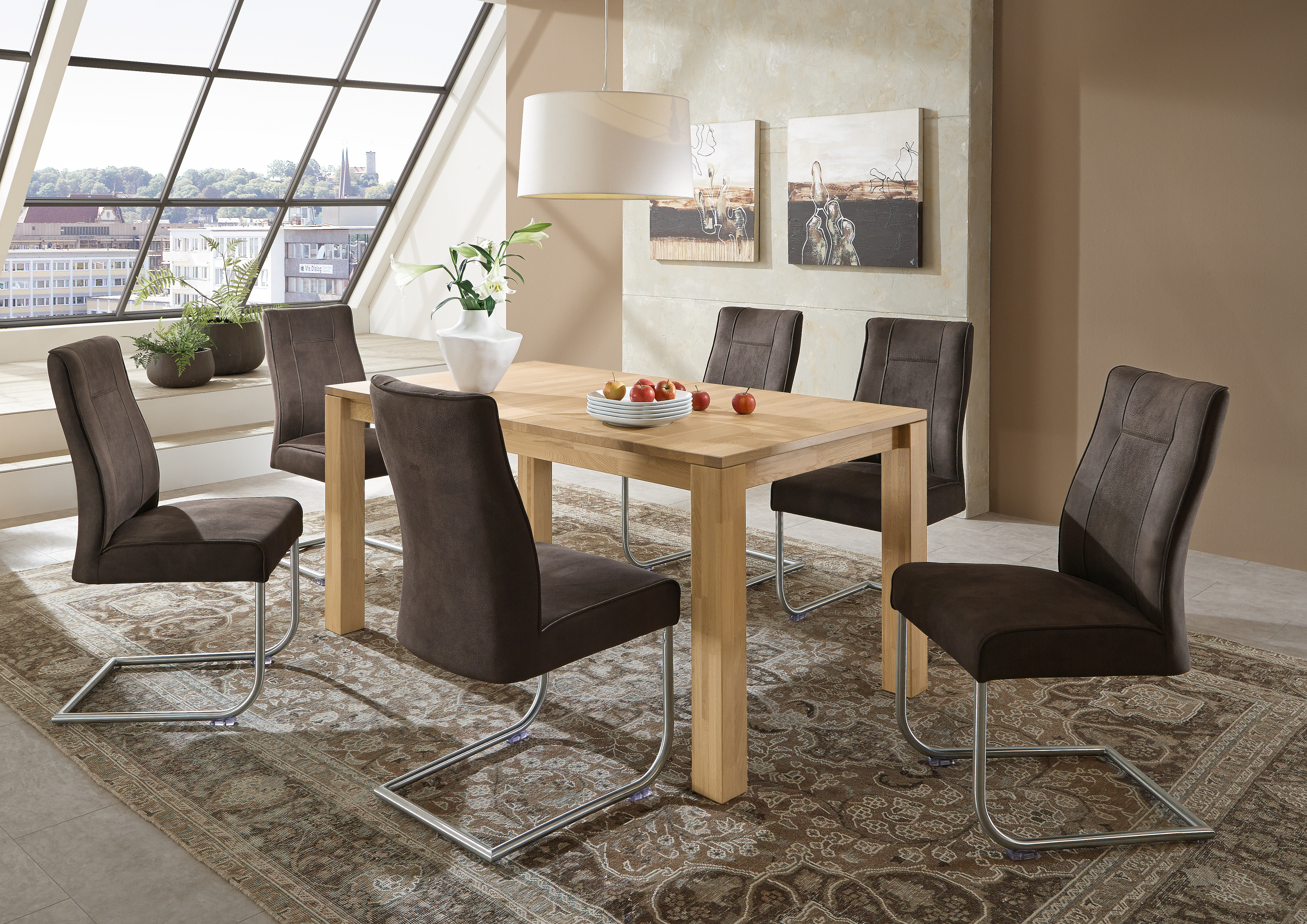 Ob morgens beim gemütlichen Kaffeetrinken oder beim entspannten Dinner in Zweisamkeit, an diesem Esstisch nimmt man gerne Platz. Der Tisch aus Eiche kann mit seinem harmonischem Gesamtbild in nahezu jedem Raum zu einem totalen Blickpunkt werden. Die schöne Gesamtoptik des Tischs passt beinahe in jede Einrichtung und lässt sich mit unterschiedlichsten Möbelstücken kombinieren. Sie werden an diesem Tisch viele unvergessliche Momente mit Ihren Liebsten schaffen.