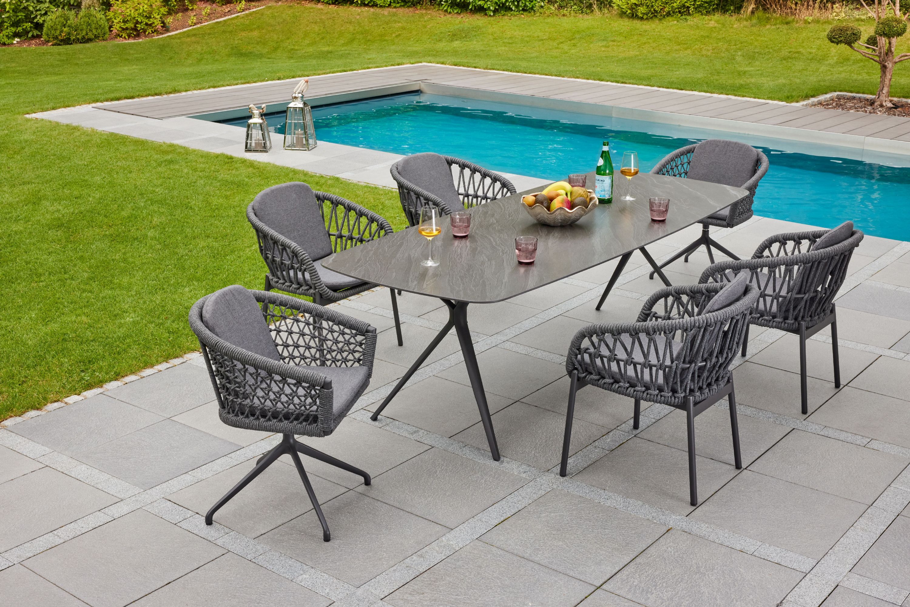 · Kissen: Stoff dunkelgrau · Gestell: Aluminium anthrazit · Seil: 12mm rund dunkelgrau ·... mehr