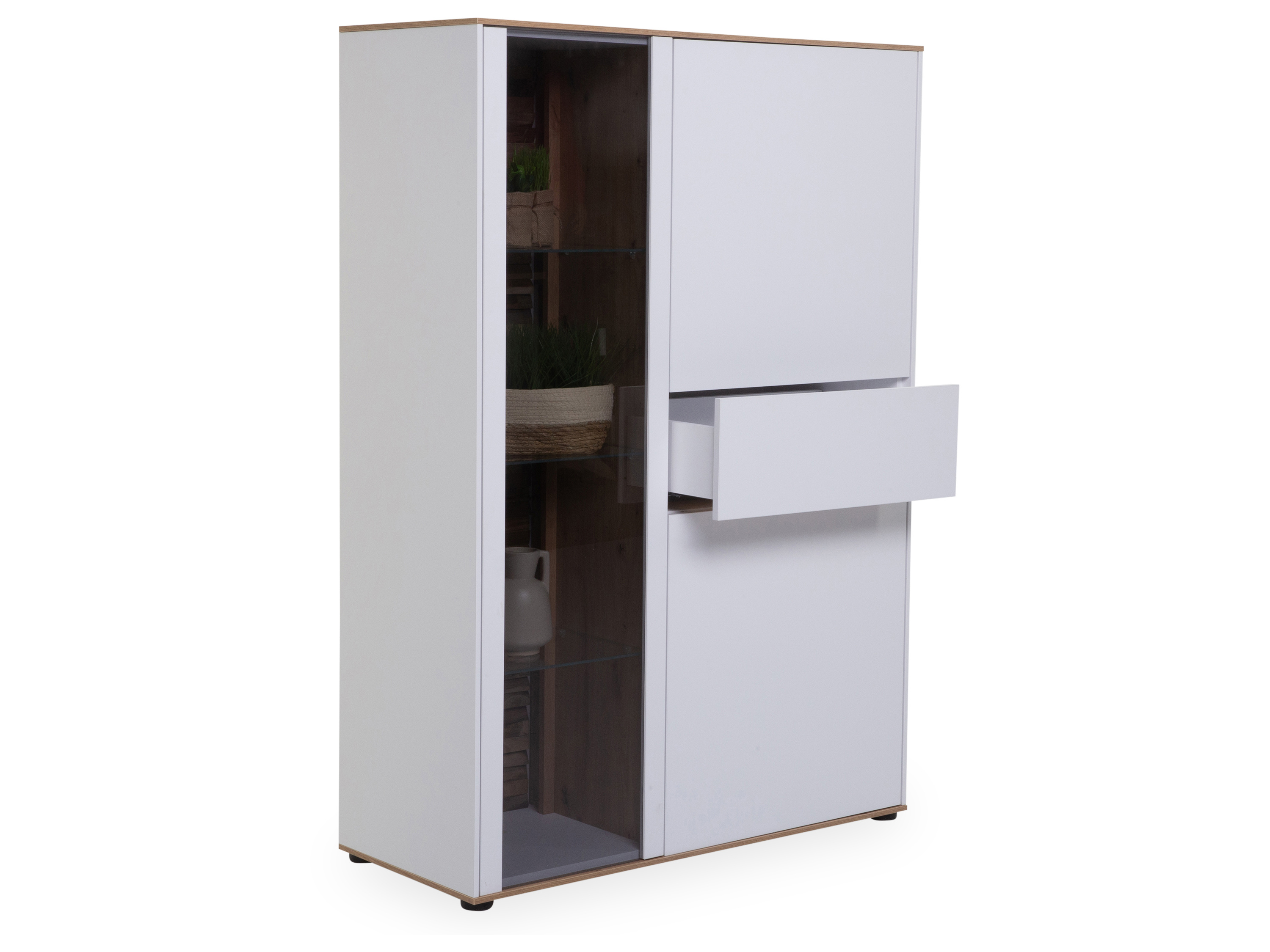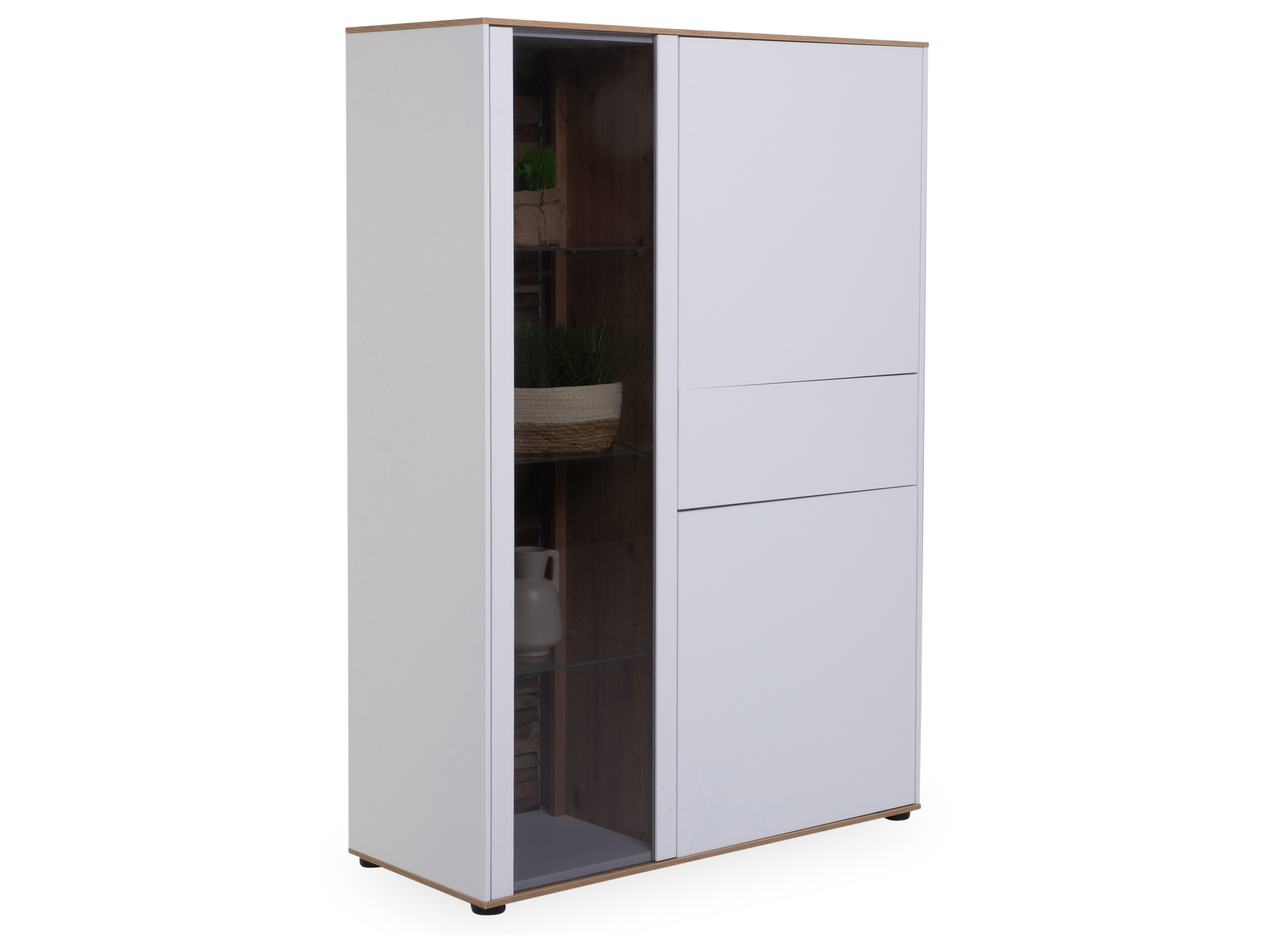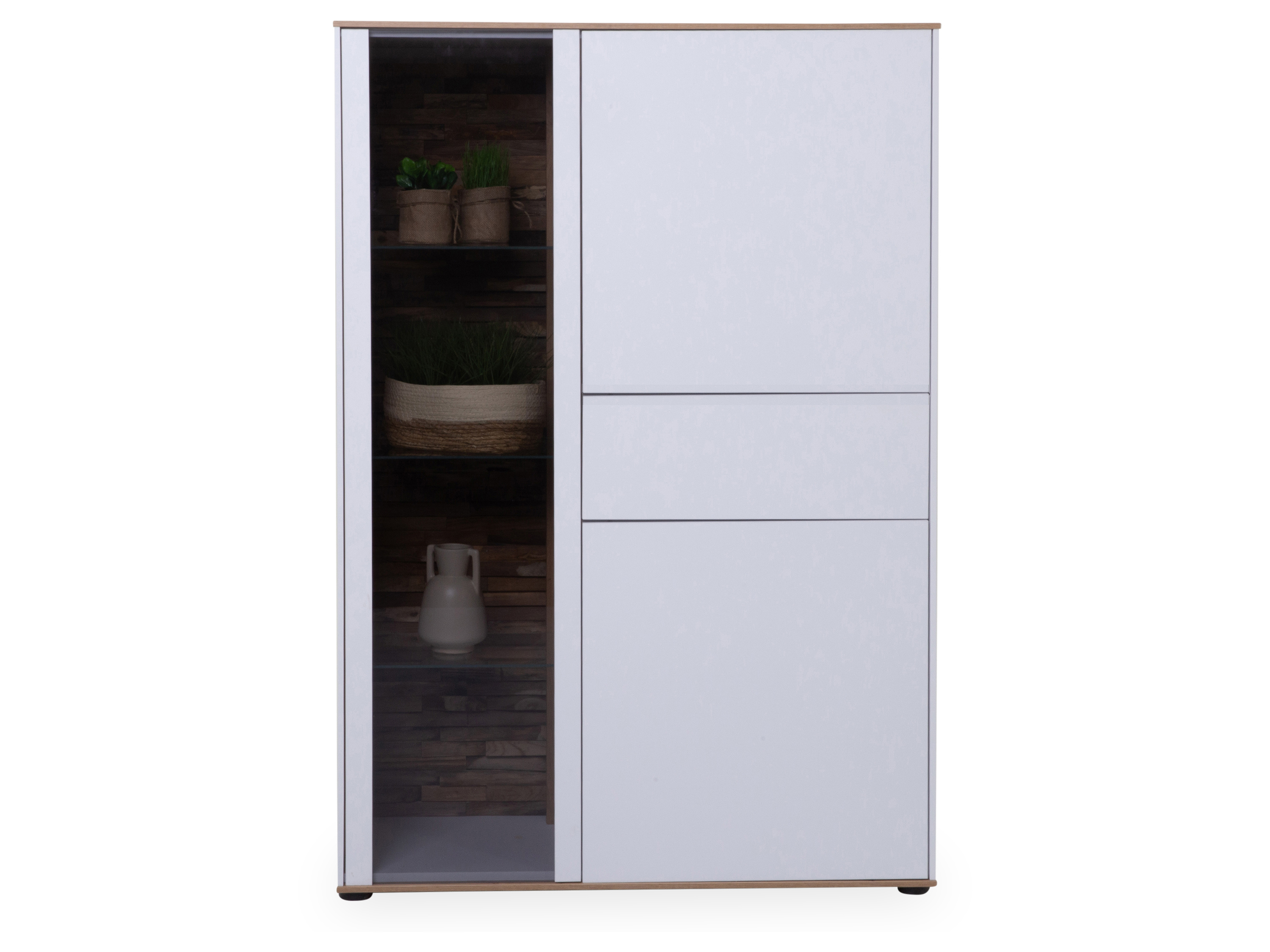 · mit zwei Holztüren, einer Glastür, einer Schublade, einem Mittelboden, zwei Einlege- und drei Glasböden