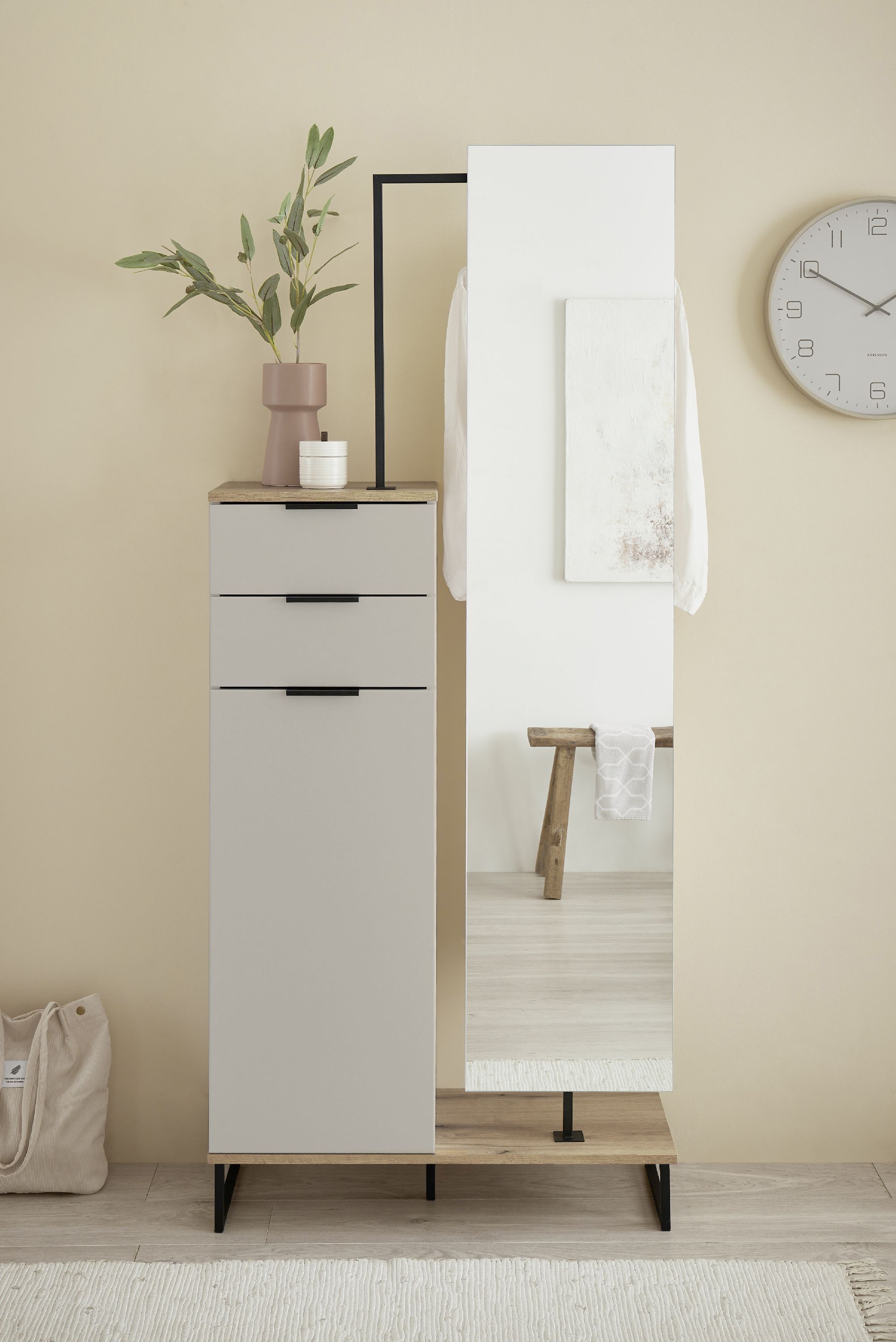 · ein Spiegel, eine Kleiderstange, Split