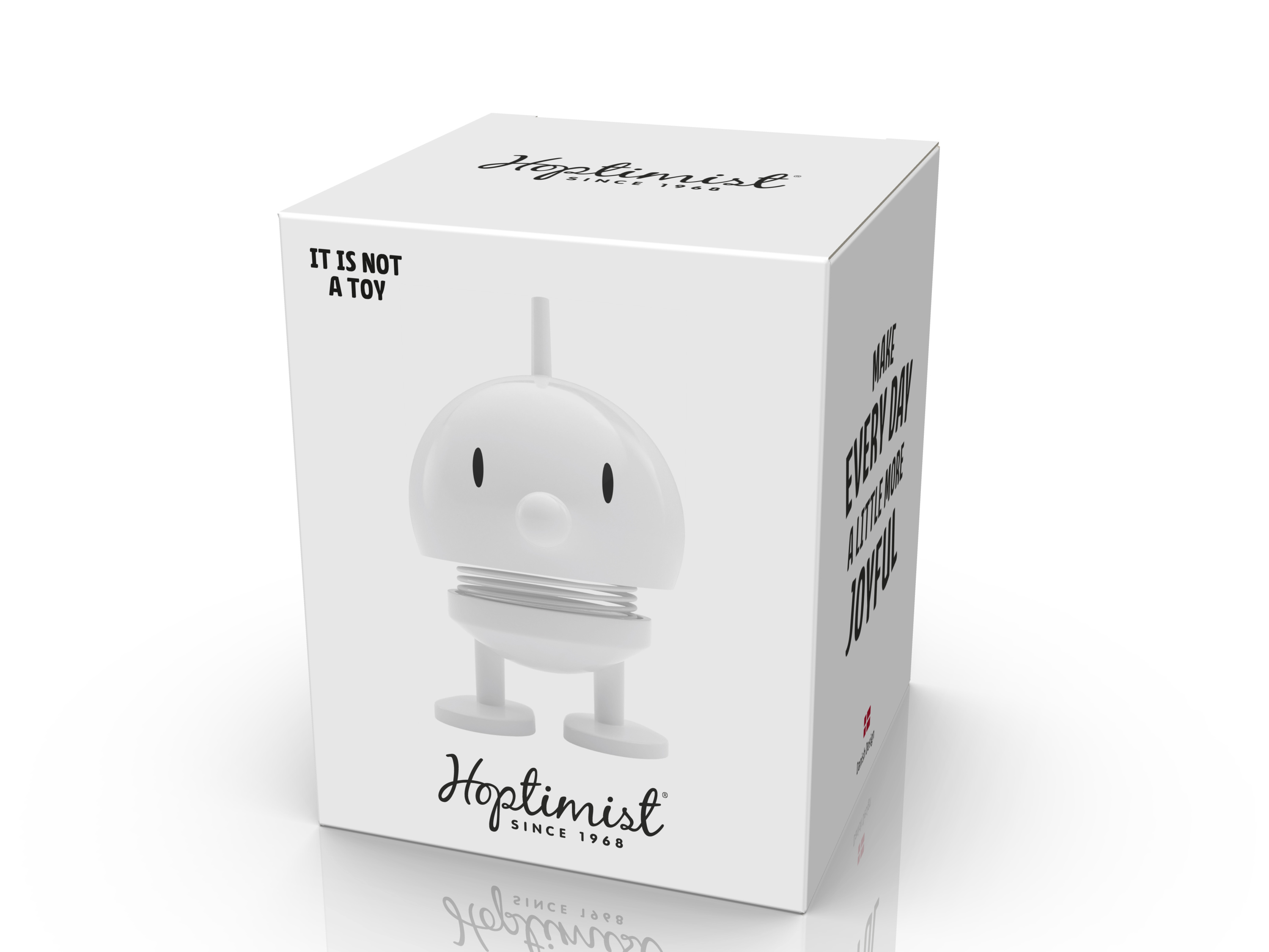 · Mit einem starken Glauben an die Kraft des Lächelns schuf Gustav Ehrenreich Ende der 1960er Jahre seine fröhliche Hoptimisten-Bewegung. Das Ziel war es, eine Figur zu schaffen, die eine ewige Erinnerung daran bilden sollte, positiv und optimistisch zu bleiben. Denn obwohl die 60er Jahre oft als The Happy 60ies bezeichnet werden, war das Jahrzehnt von Unruhen geprägt. Daher war Ehrenreichs Design ein gern gesehener Freudenspender in einer in einer ansonsten eher turbulenten Zeit. Bimble und Bumble repräsentieren die allerersten Hoptimisten aus der Hand des Designers: Ein für die Schule gekleidetes Mädchen mit lächelnden Augen und ein aufmerksamer Junge mit einem Splint auf dem Kopf. Die fröhlichen Hoptimisten sind heute ein Teil der dänischen Designgeschichte und sorgen weltweit für Freude. Die Figuren sind in vier verschiedenen Größen und in einer breiten Farbpalette erhältlich, die jede Menge Energie, gute Laune und Freud verbreiten.Es gibt garantiert einen Hoptimisten für jeden Anlass und für jede Person.