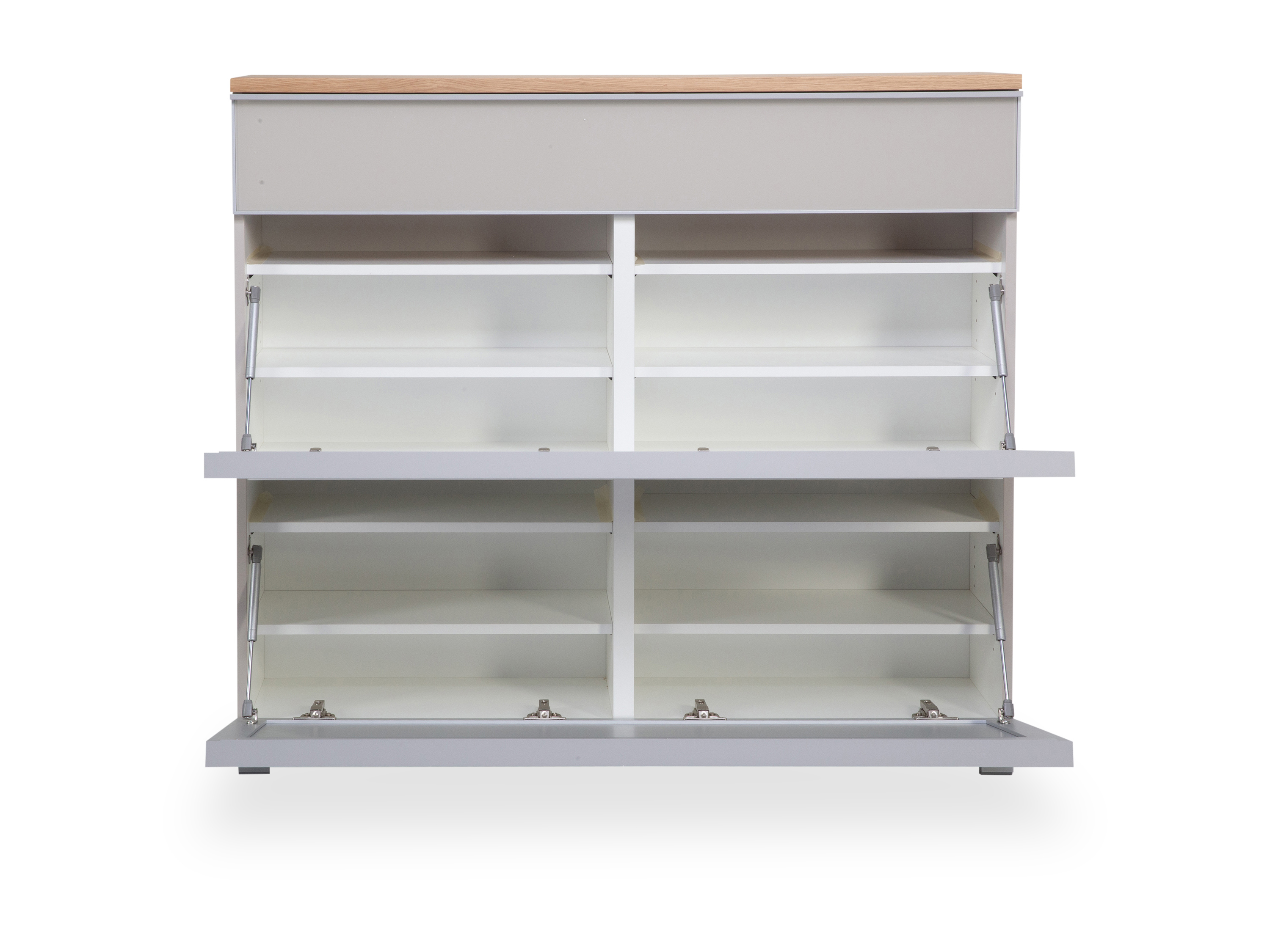 · eine Mittelseite, ein Schubkasten, zwei Klappen mit je vier verstellbaren Holz Einlegeböden