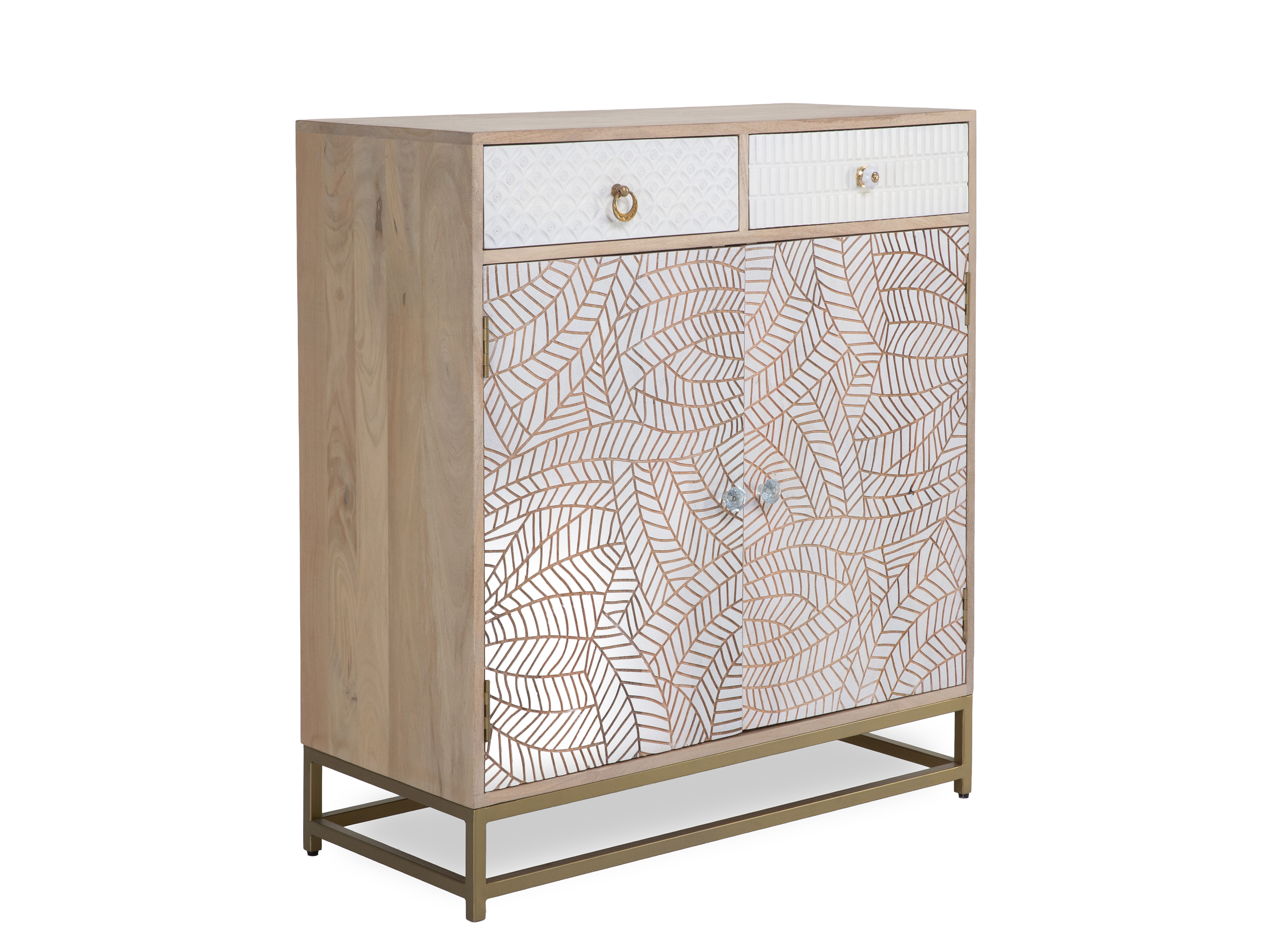 · Korpus: Mango natur · Front: weiß lackiert · Gestell: Metall gold lackiert · mit zwei Türen... mehr