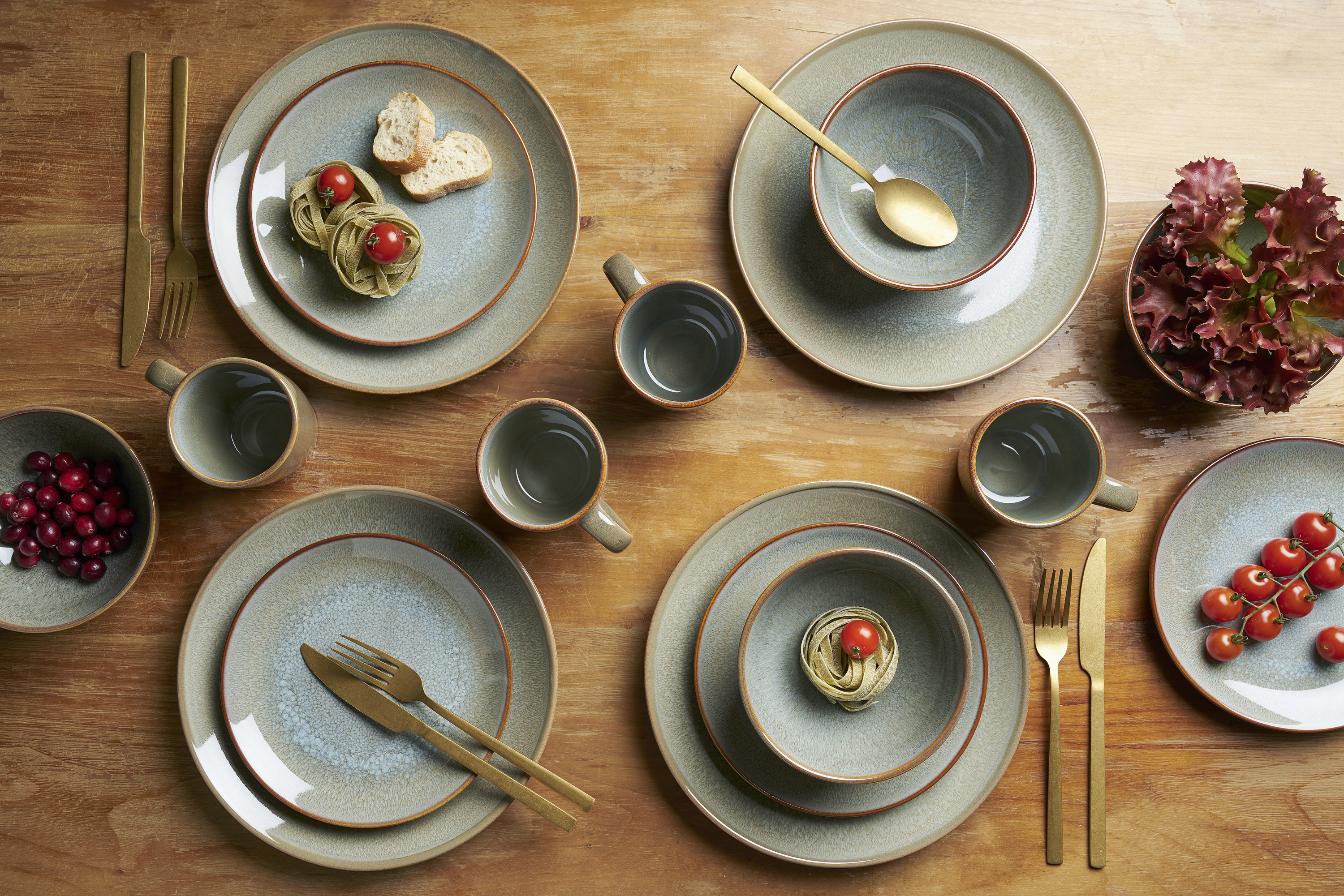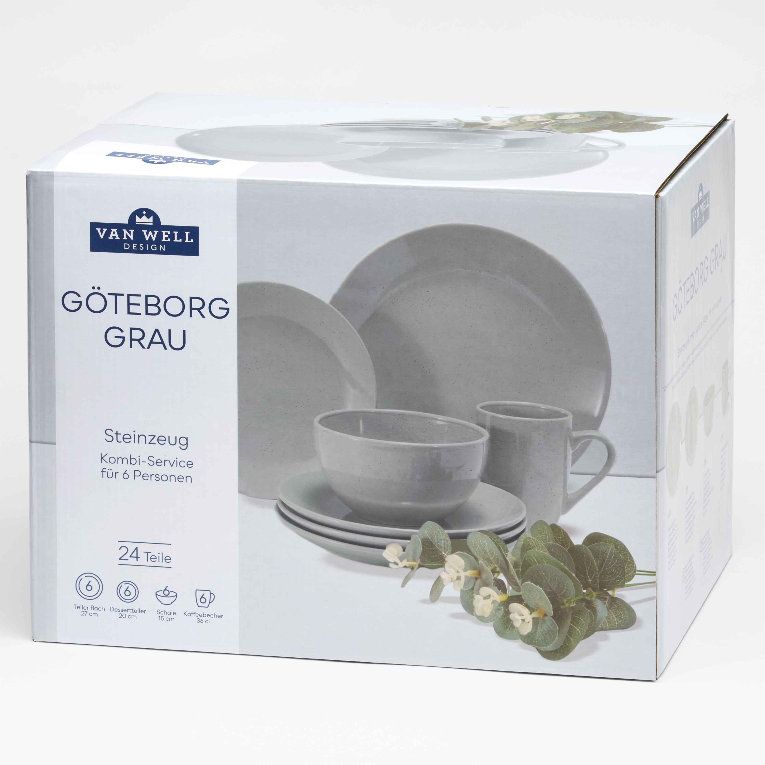 · bestehend aus: 6 x Kaffeebecher 360ml 6 x Dessertteller 20cm 6 x Speiseteller 27cm 6 x Müslischalen 15cm/660ml