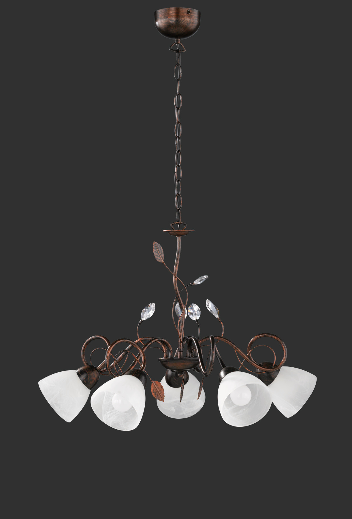 · Kronleuchter zaubern ein glamouröses Ambiente in Ihre Wohnräume und verschaffen dem Raum so viel Eleganz wie keine andere Leuchte. Dabei kommt der Kronleuchter am besten zur Geltung, wenn er mittig im Raum oder über einem Esstisch platziert wird. Der fünfflammige Kronleuchter hat einen Durchmesser von 70 cm und eine Abhängelänge von maximal 150 cm. Der Kronleuchter TADITIO kombiniert die klassische Eleganz eines Kronleuchters mit traditionellen Formen und Farben. Die rostfarbig antike Farbgebung in Verbindung mit alabasterfarbenen Glas und vereinzelten Kristallblättern verleihen Ihrem Wohnraum das gewisse Etwas. Für eine energiesparende Beleuchtung empfiehlt sich die Verwendung eines LED Leuchtmittels. Diese sind eine optimale Alternative zu herkömmlichen Halogen Leuchtmitteln und stehen für eine hohe Lichtqualität und eine Energieeinsparung von bis zu 80%. Zusätzlich profitieren Sie bei LED Leuchtmitteln von einer langen Lebensdauer, einer geringen Wärmeentwicklung und schonen gleichzeitig die Umwelt.