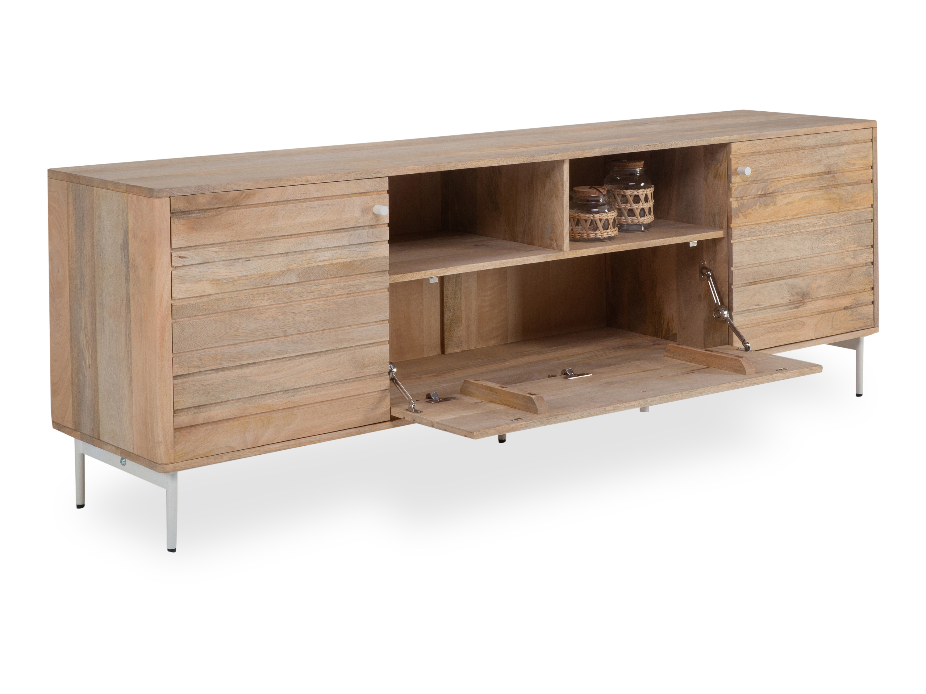 · mit zwei Holztüren, einer Klappe und zwei offenen Fächern