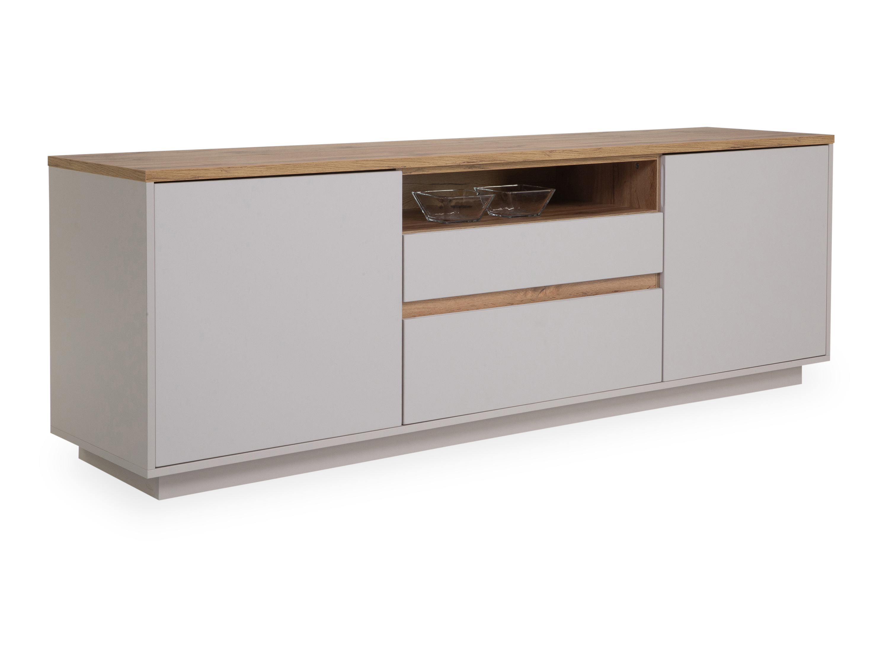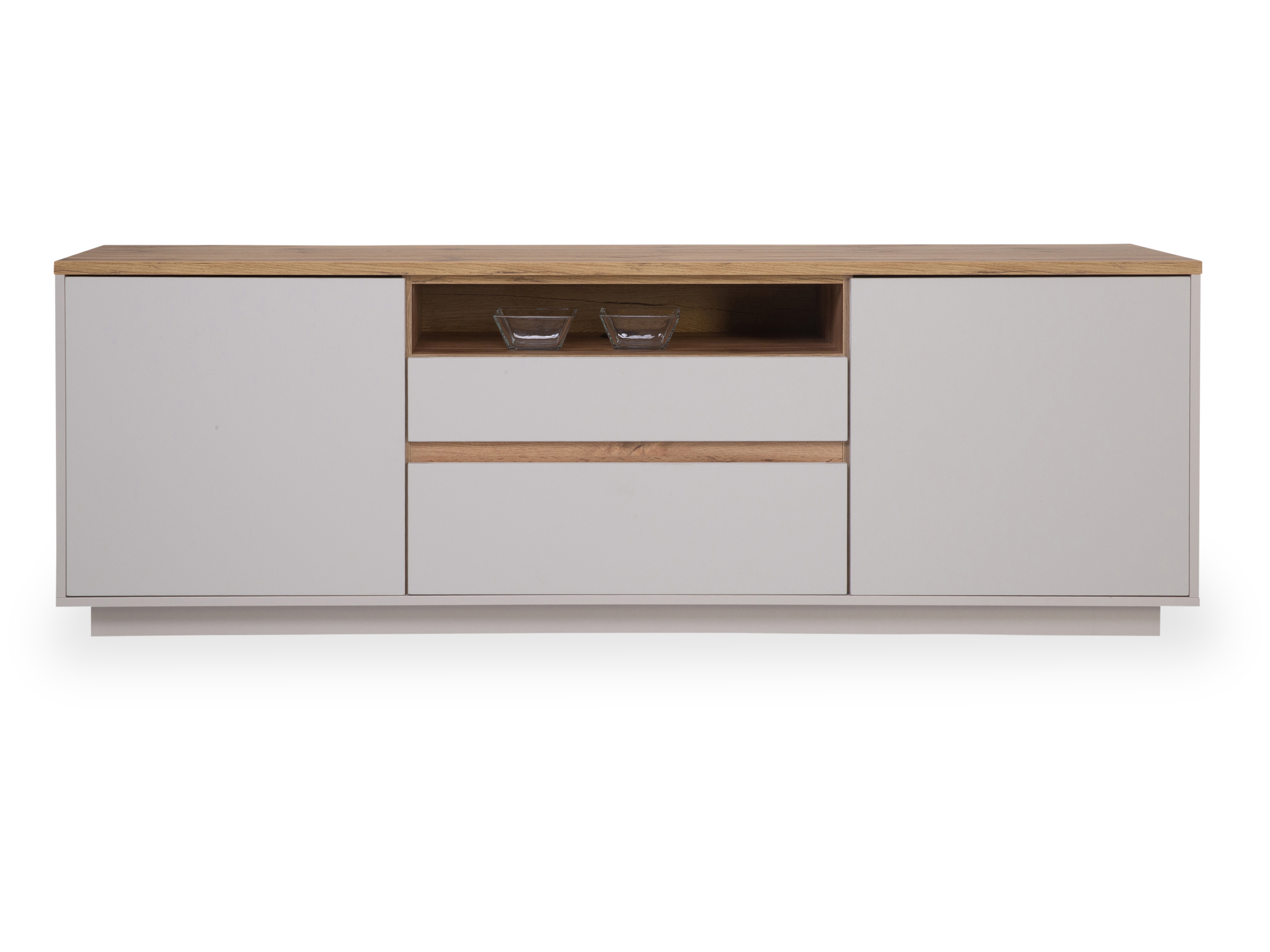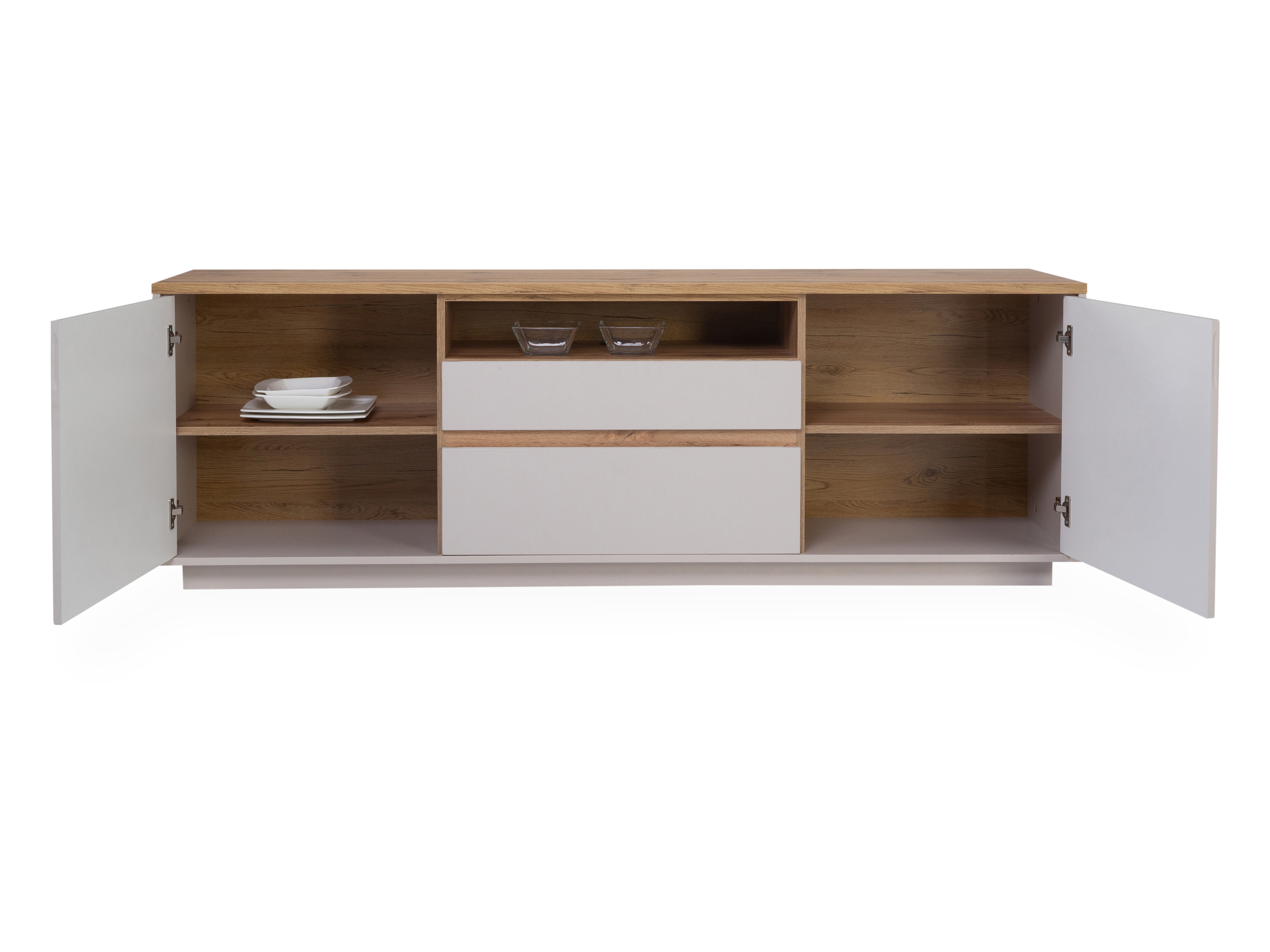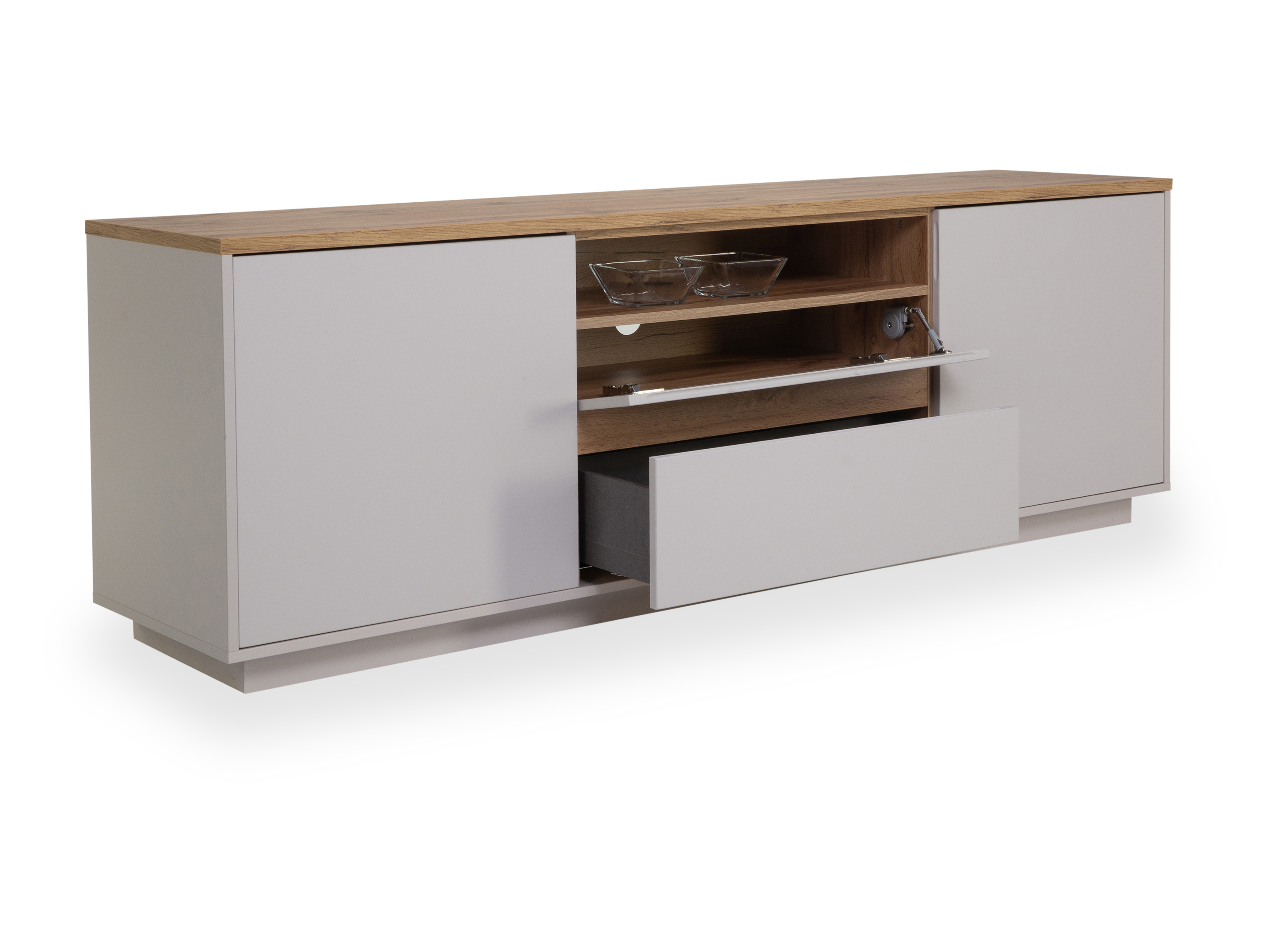 · mit zwei Holztüren, ein offenes Fach, einer Klappe und einem Schubkasten