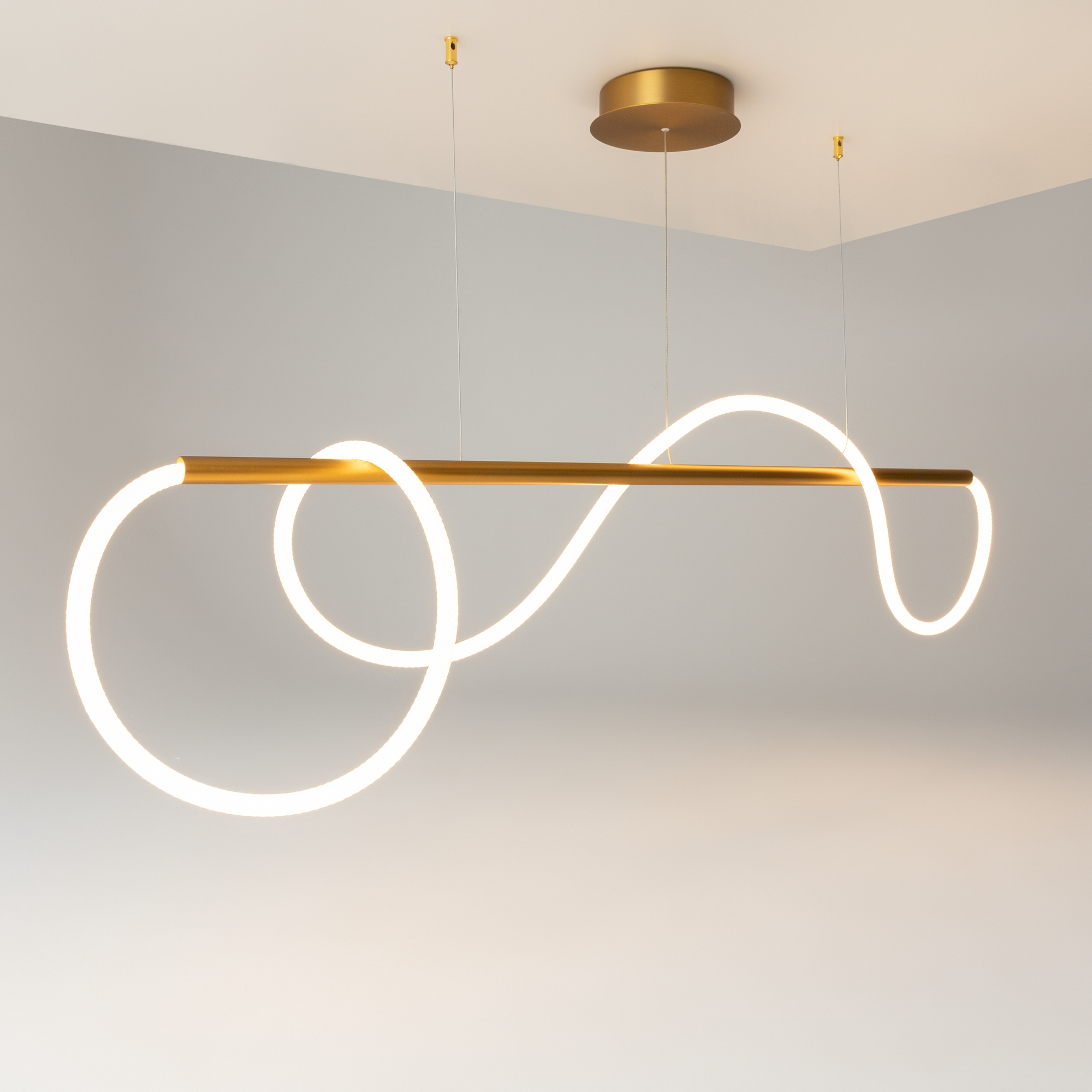 · Rahmen aus Aluminium. Farbtöne: Gold, eine Kombination aus Gold und Schwarz. Zwei Arten von Diffusoren: Ein Silikonschlauch und ein superfestes Kabelbündel (vergilbt im Laufe der Zeit nicht, hat eine hohe Festigkeit). Weiches, gleichmäßiges Leuchten dank der hohen Dichte der LEDs. Farbtemperatur 3000K. LED-Lichtquelle.