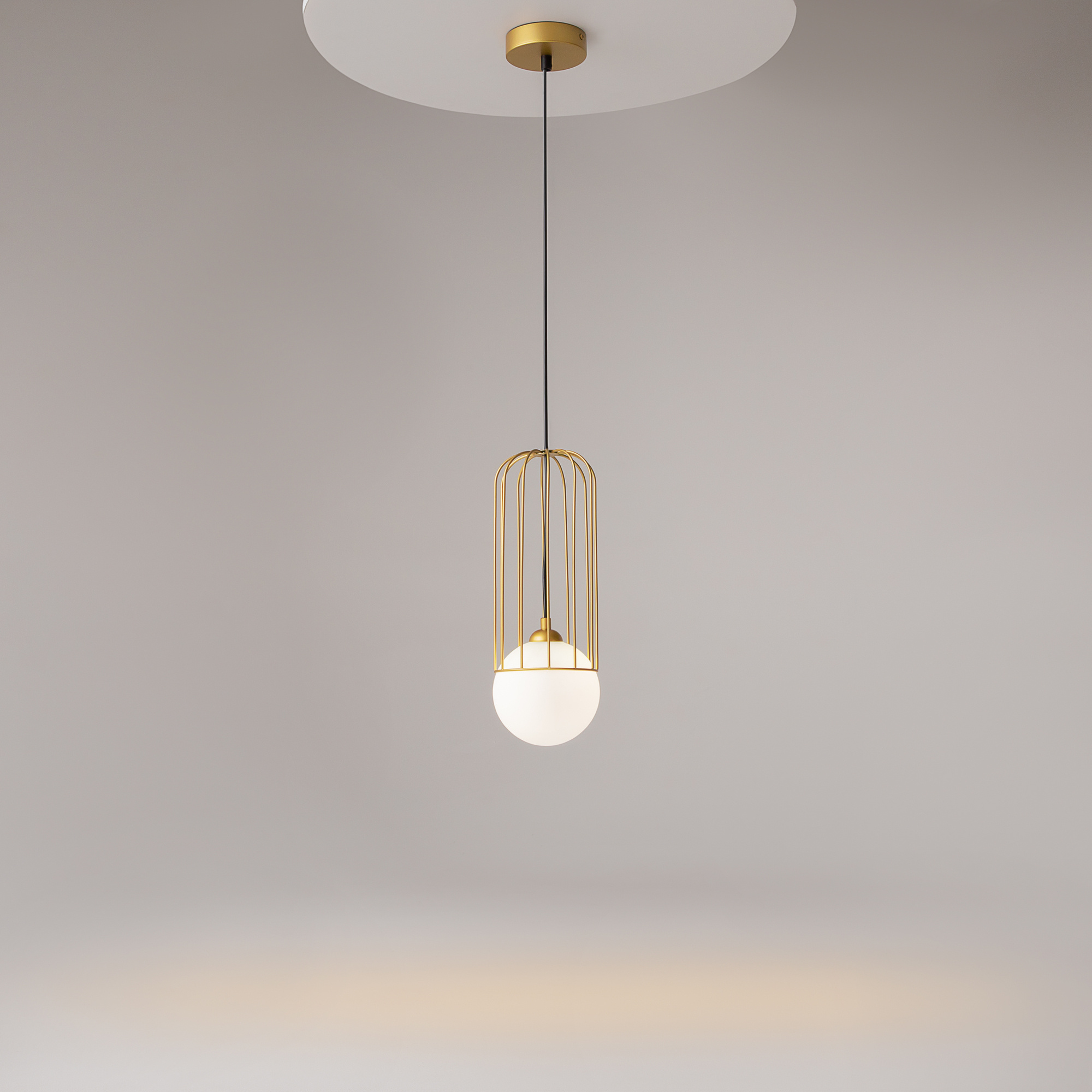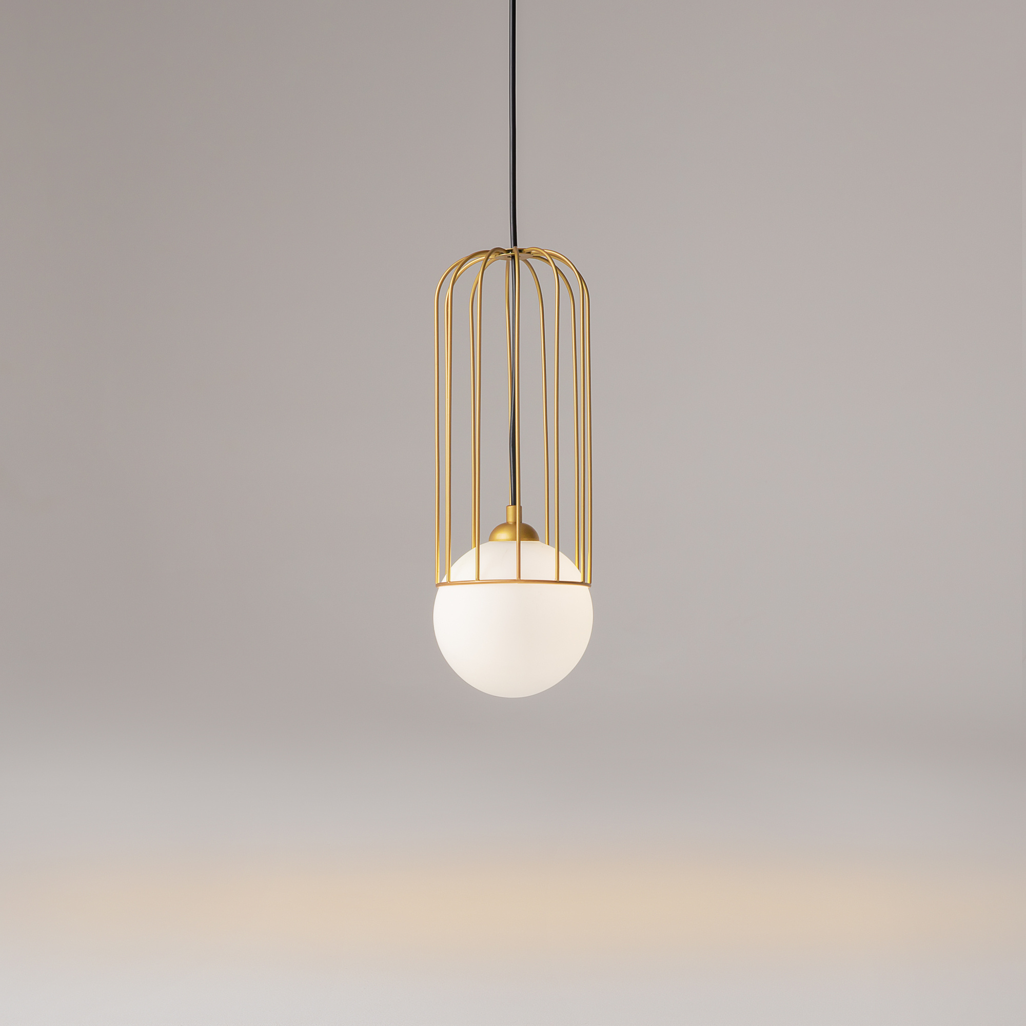 · Metallbeschläge in Gold. Lampenschirm aus weißem Milchglas. Dekor des Lampenschirms Telford: Ein Stahldrahtgitter im Farbton der Beschläge. Einstellbare Höhe.