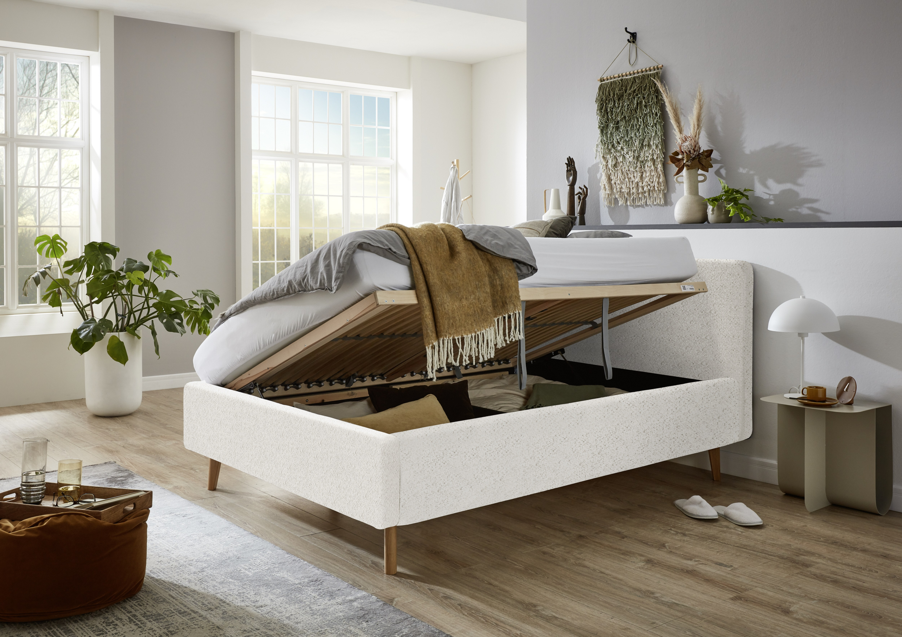 · Polsterbett mit glatten Kopfteil, inkl. belüftetem Bettkasten und seitlich zu öffnende Federholzrahmen, 28 Leisten starr mit Härtegradverstellung