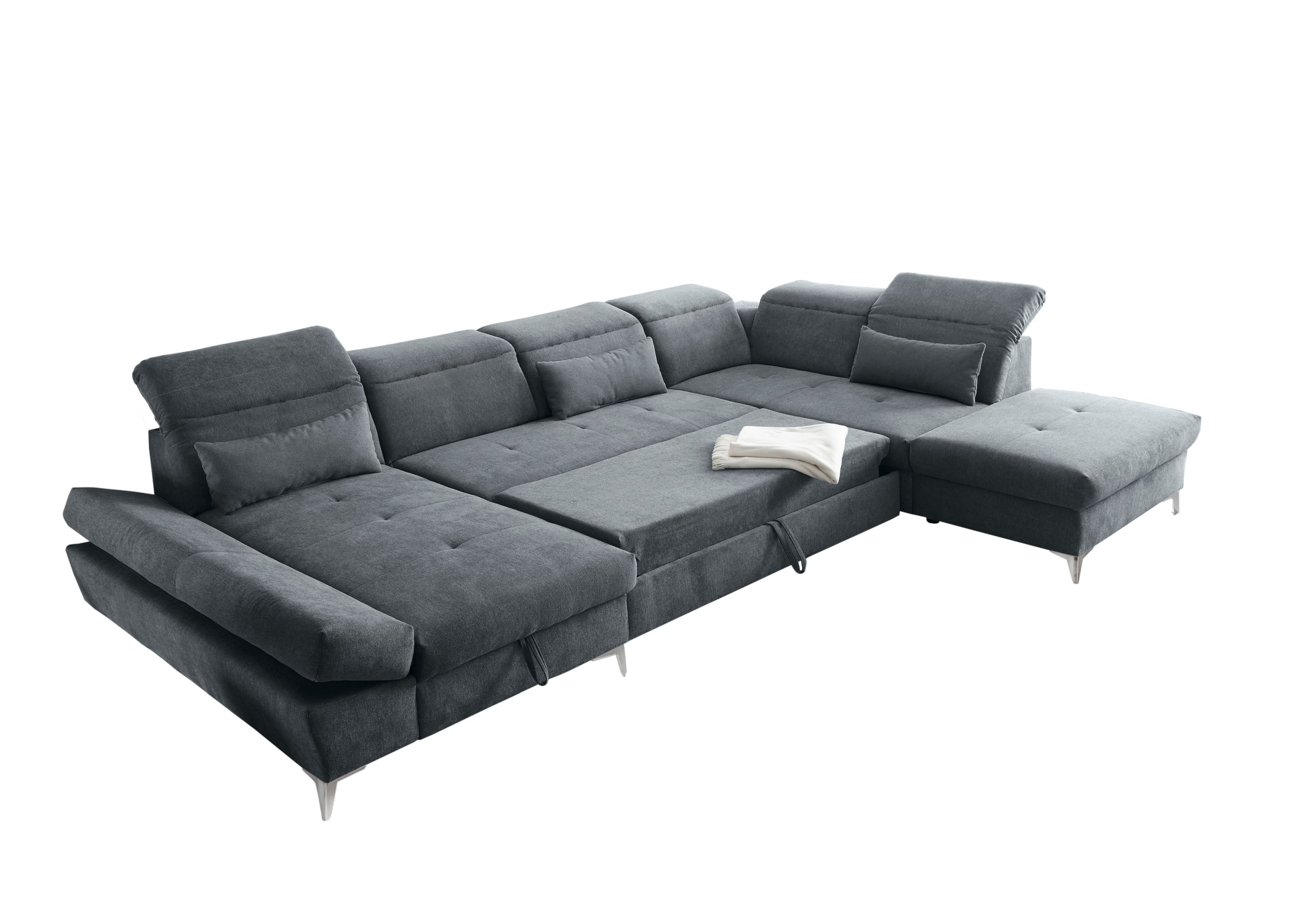 Bereichern Sie Ihren Wohnraum mit der Verwandlungsecke SELF COSIMA. Diese stilvoll gestaltete Verwandlungsecke erscheint in Anthrazit und besitzt eine bequeme Sitzfläche mit Nosagunterfederung. Zudem lässt sich die Verwandlungsecke mit Handumdrehen zur gemütlichen Schlafgelegenheit umfunktionieren. Dabei ist die Liegefläche mit 120 x 300 cm sehr geräumig. Außerdem gehören drei Nierenkissen sowie sechs Kopfteilverstellungen zu dieser Verwandlungsecke, sodass für reichlich Komfort gesorgt ist.