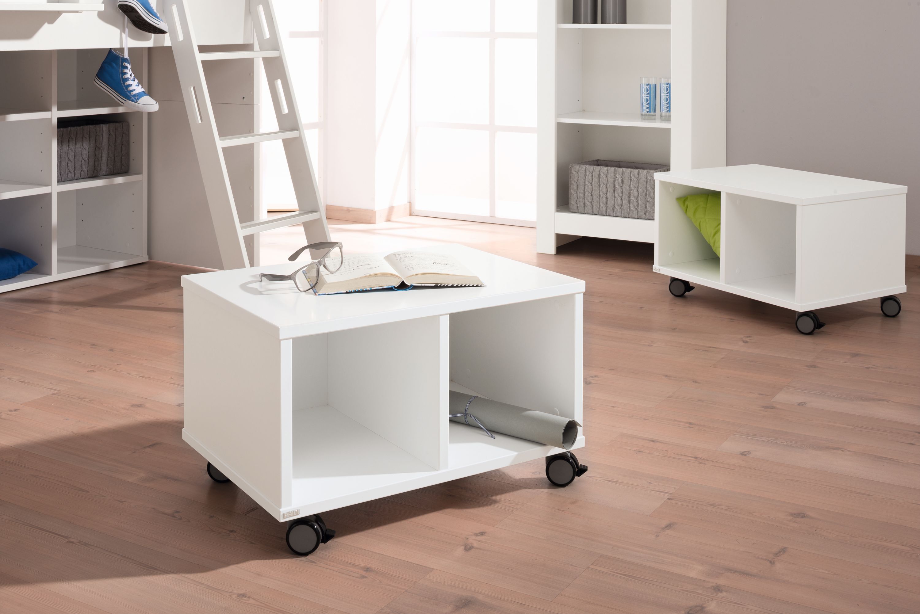 Kreideweiß mit 2 Fächern, 4 Universalrollen, 2 davon feststellbar