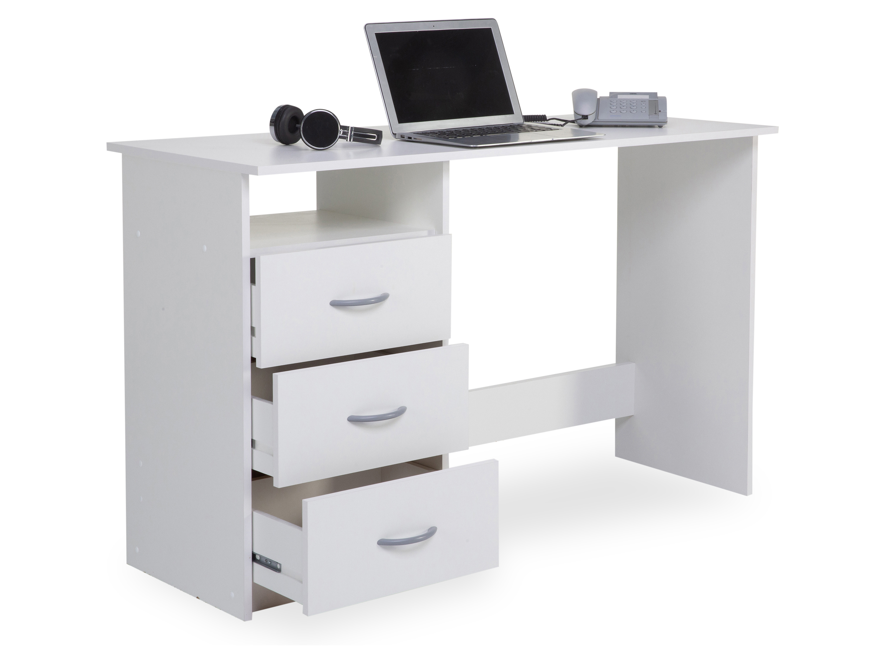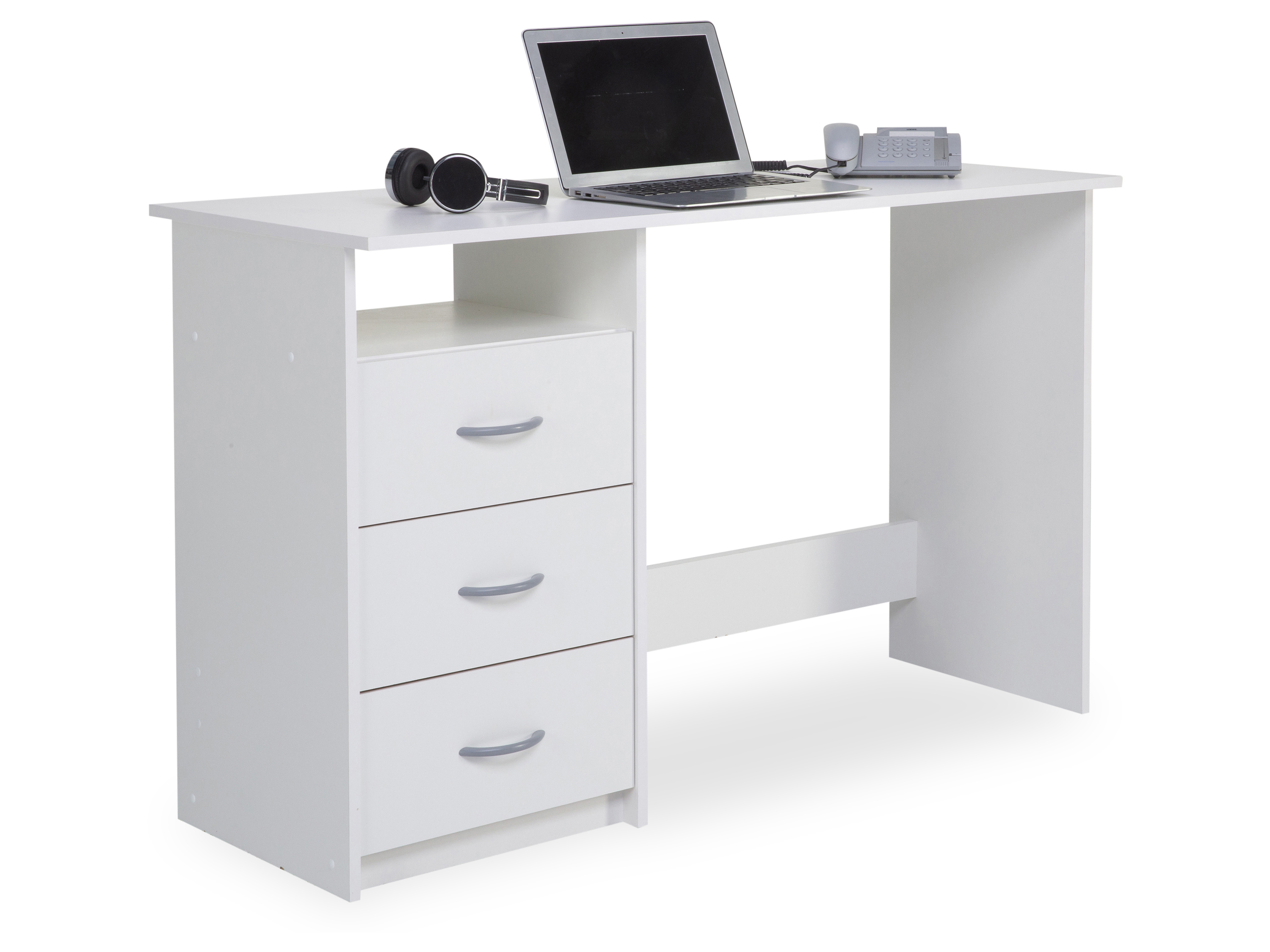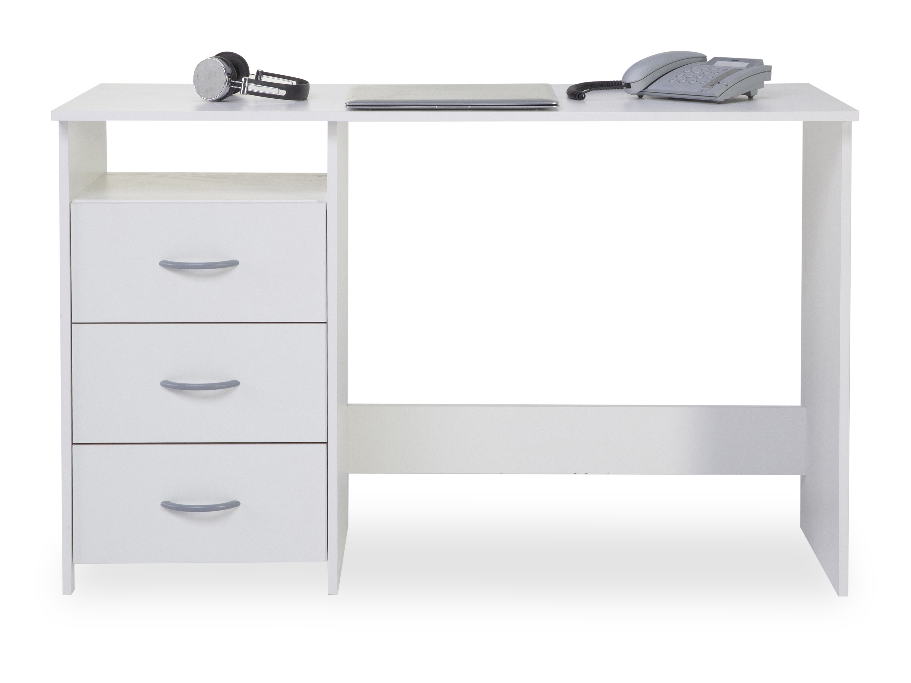 Ob im Home oder im Back-Office, dieser Schreibtisch begeistert auf ganzer Linie. Der Schreibtisch verbreitet dank seiner Materialauswahl eine Atmosphäre, in der Sie besonders konzentriert nachdenken können, und ergänzt Ihre Einrichtung mit seiner stilvollen Optik um eine besondere Note. Er erweist sich als funktionale sowie optische Bereicherung für Ihr Heimbüro. Das Büromöbelstück vervollständigt Ihr persönliches Wohlfühlkonzept dank des modernen Designs und ist weiß. Es besitzt eine Gesamtbreite von 123 cm, eine Höhenabmessung von 77 cm und ein Tiefenmaß von 50 cm. Der Arbeitsplatz daheim wird mit diesem Schreibtisch praktisch und schön eingerichtet.