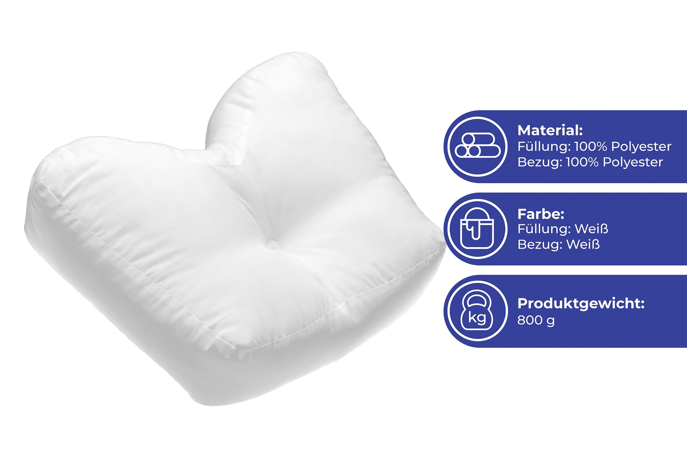 · Bezug mit Reißverschluss, Seitenschläferkissen - Für ruhigen Schlaf und einen frischen Start in den neuen Tag Ca. zwei Drittel alle Menschen schlafen auf der Seite. Dadurch gerät die Nackenwirbelsäule in eine Schieflage, das Ohr wird gequetscht und die Schulter stark belastet. Traditionelle, quadratische Kissen werden mehrmals pro Nacht zurechtgeknuddelt, um eine bequeme Schlafposition zu finden. Vielen Nackenstützkissen fehlt der Kuschelfaktor. Dieses Seitenschläferkissen ist eine echte Innovation: Die Schulter-Aussparung. Die Schulter wird nicht mehr abgeknickt und befindet sich stets in einer bequemen Lage. Der Arm schläft nicht mehr so schnell ein. Die Ohr-Vertiefung. Das Ohr liegt sanft in einer kleinen Kuhle und wird nicht abgequetscht. Die Dicke des Kissens. Das Kissen ist mit 16,5 cm deutlich dicker als ein herkömmliches Kissen. Die Hochbausch-Fasern sehr gut ihre Form und vermeiden effektiv ein Plattliegen des Kissens. Das gibt besten Halt und bringt die Nackenwirbelsäule in eine entlastende, gerade Liegeposition. Die “Kuschelohren“. Sie ermöglichen das bequeme Einkuscheln - das Umarmen“ - was mit den meisten Nackenstützkissen nicht möglich ist. Seitenschläfern ermöglicht dieses Kissen eine optimale Liegeposition für einen ruhigen, erholsamen Schlaf. Maße: ca. 52 x 40 x 16,5 cm, 800g. Füllung: antiallergische 3D-Hochbausch-Polyester, außen Mikrofaser. Mit Bezug aus 100 % Polyester. Bezug abnehmbar und bei 30º maschinenwaschbar, trocknergeeignet. Der Bezug besteht aus 100% Polyester. Die Füllung ist aus 100% Polyester gefertigt.