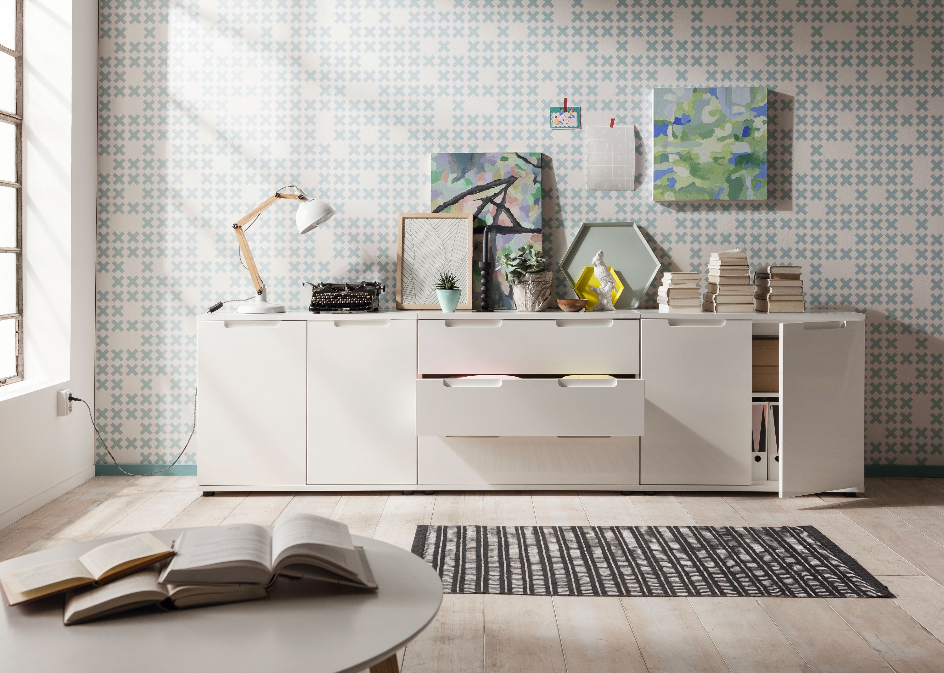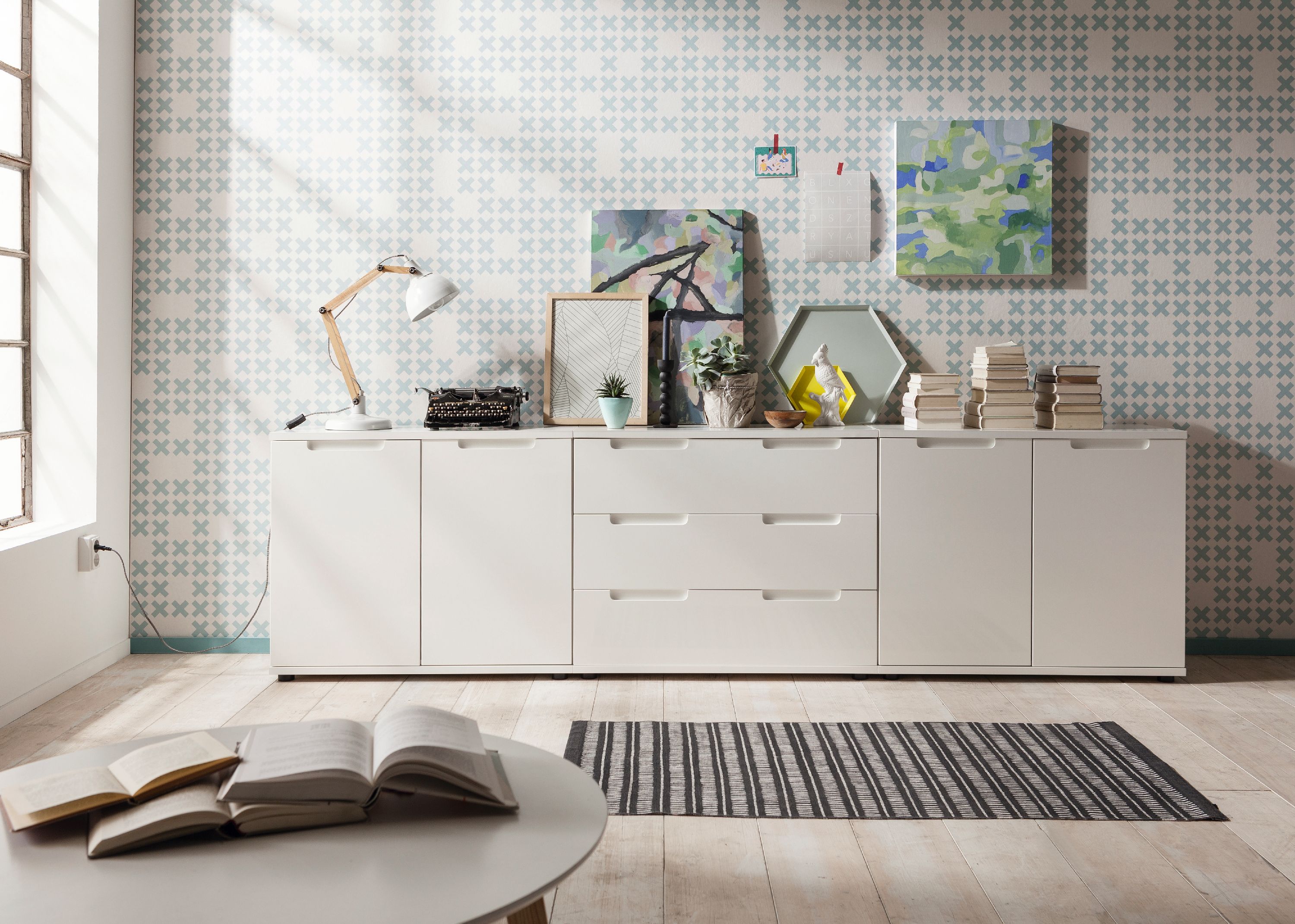 Modern und stilvoll präsentiert sich das großzügige Sideboard NELLI von SELF. Der weiße Dekor-Korpus des Sideboards wird von einer weißen Hochglanzfront in weißem Lack abgerundet und wirkt dadurch sehr schick. Durch das schlichte Design ist das Sideboard in verschiedenste Einrichtungsstile integrierbar und kann individuell kombiniert werden. Hinter den vier Türen und in den drei Schubladen kannst du diverse Dinge schnell, praktisch und ordentlich verstauen, sodass du einen guten Überblick erhältst. Dabei besteht das Sideboard insgesamt aus drei Kommoden. Ob im Schlaf-, Arbeits- oder Wohnzimmer - mit der Kommodenserie NELLI kannst du ein Kommodensystem nach deinen Wünschen ganz einfach zusammenstellen.