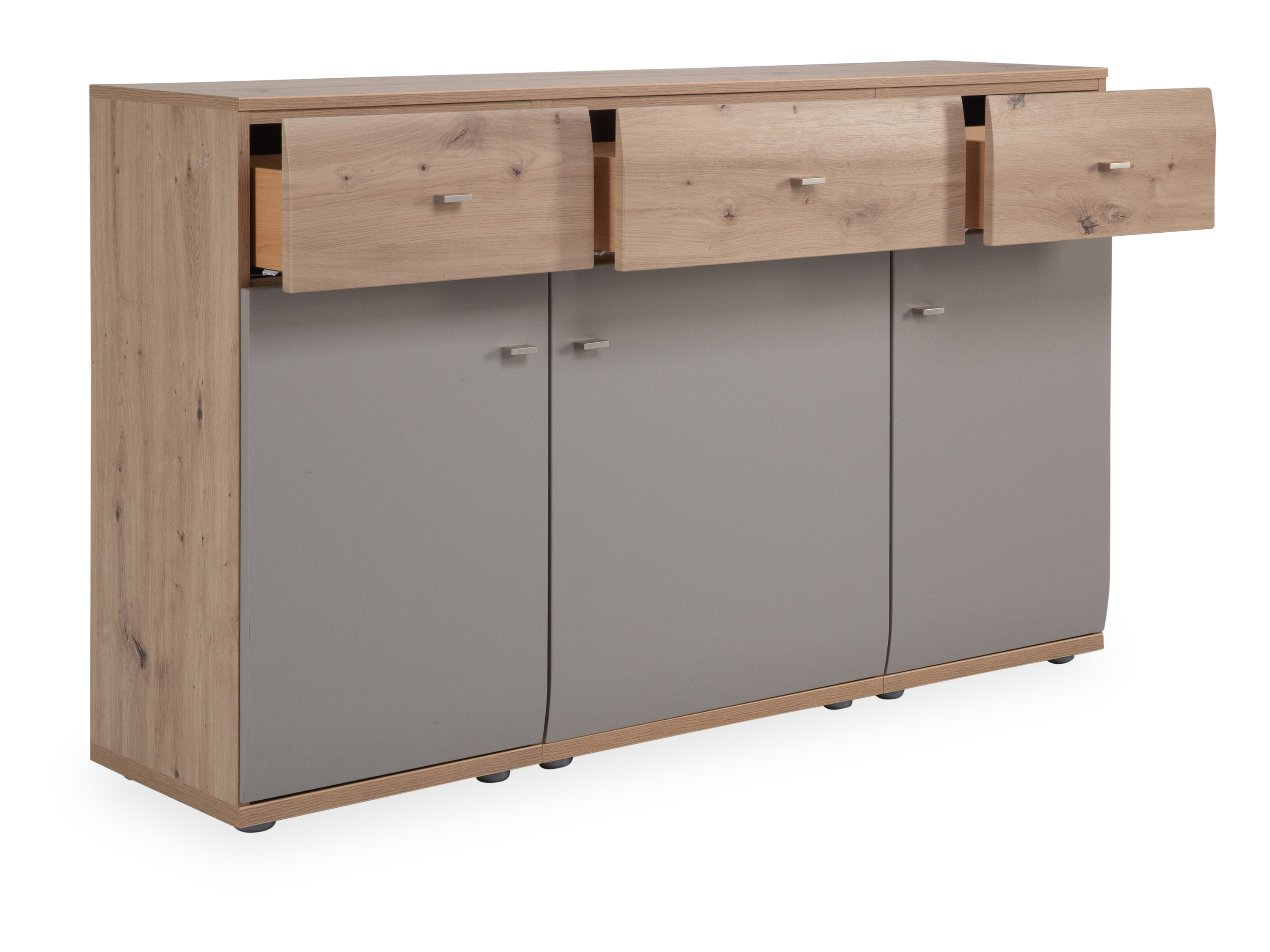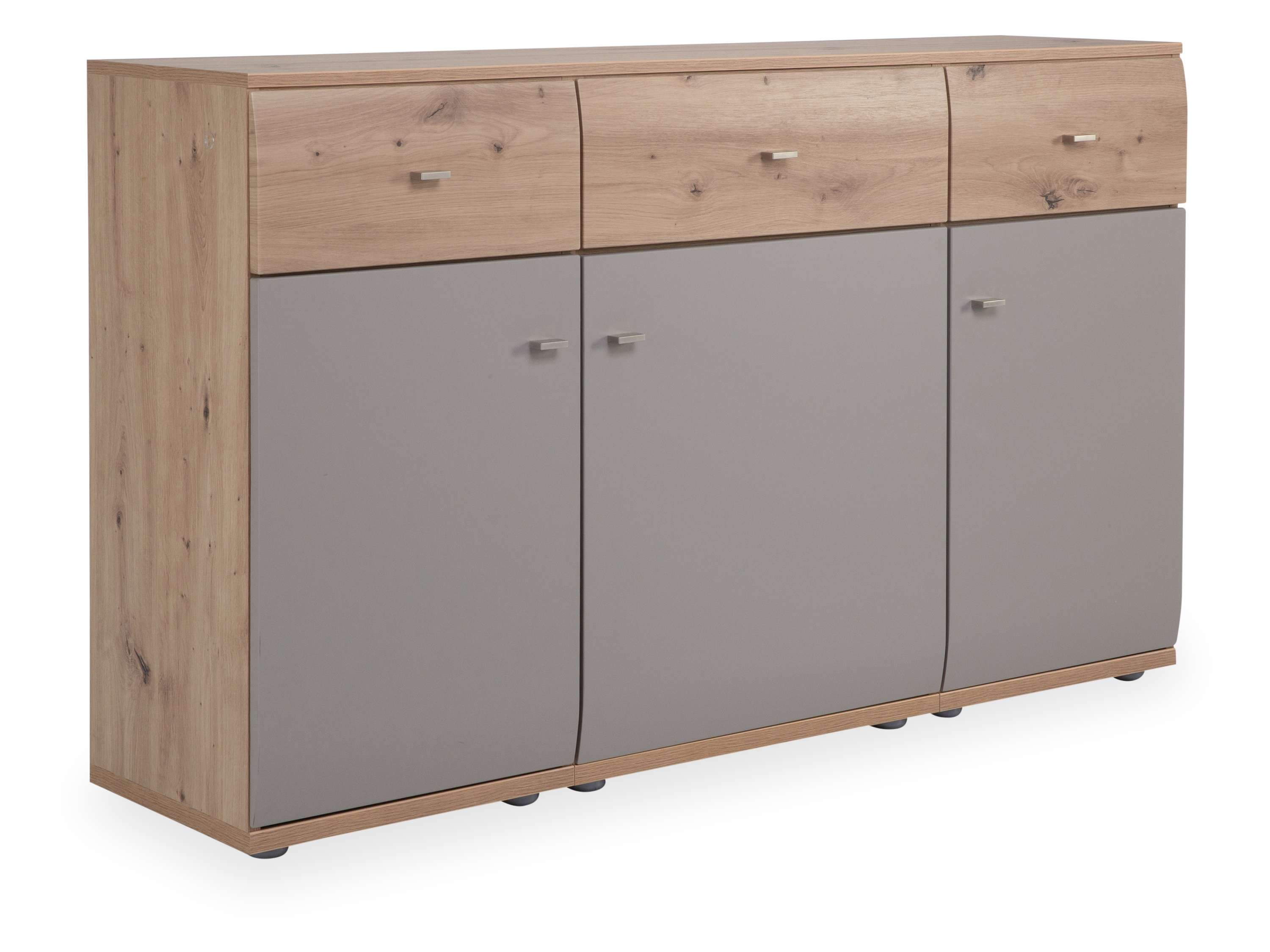 Korpus: Alteiche Nachbildung, Front: Grau matt, Absetzung: Alteiche Nachbildung, Abdeckblatt: Alteiche Nachbildung, Rückwand: Alteiche Nachbildung, Griff: matt-nickel, Türen gedämpft, Schübe mit Selbsteinzug und Softstopp, mit 3 Türen und 3 Schubladen