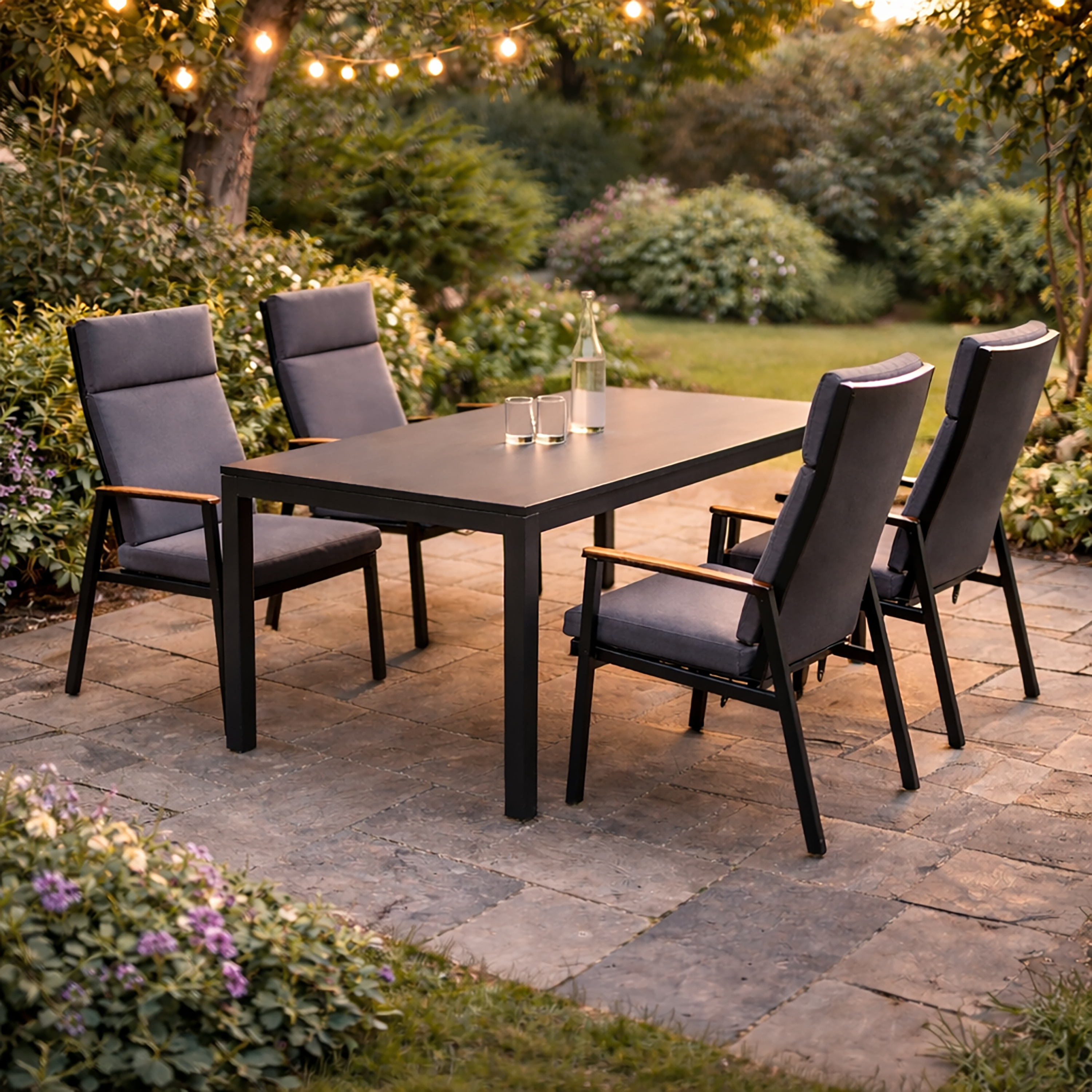 · Hochwertiges 5-teiliges Gartenmöbel- Set Bern in Anthrazit - Die greemotion Essgruppe vereint 1 Tisch Rom und 4 Stühle Bern inkl. Gasfeder - perfekt für stilvolle Outdoor-Bereiche.