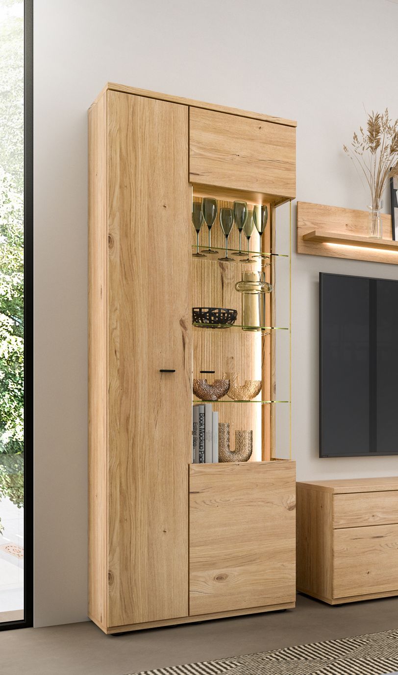 · mit einer Holztür Anschlag links, einer Holz-/Glastür Anschlag rechts mit Seitenverglasung rechts drei Glasböden und sechs Holzböden