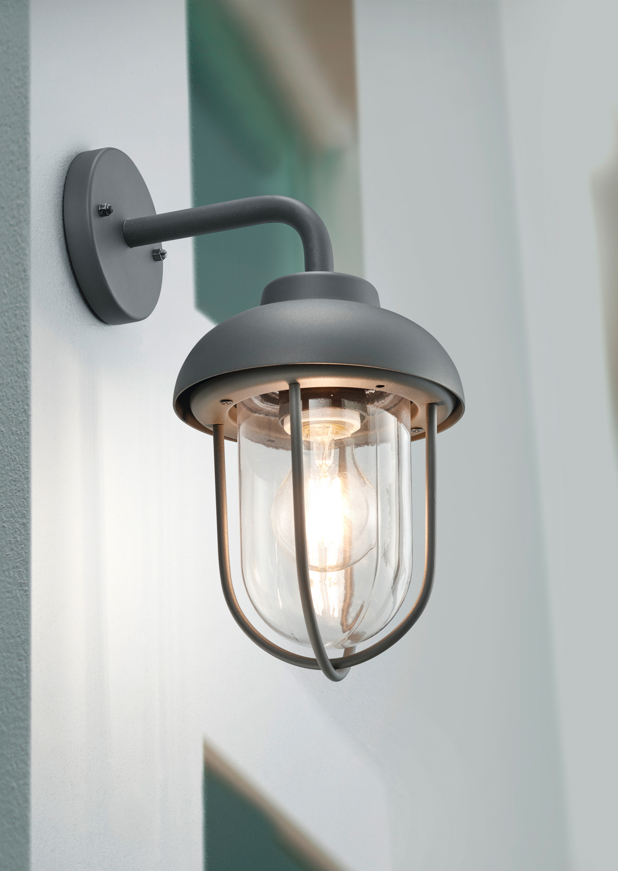 · Dekorative Gartenbeleuchtung mit der Vintage Außenleuchte DUERO. Ob zum Verweilen auf der Terrasse oder im Eingangsbereich, die modern designte Wandleuchte begleitet Sie nicht nur in der dunklen Jahreszeit, sondern auch an langen Sommerabenden. Dank der Schutzart IP44 eignet sich die Wandleuchte mit einer Höhe von 32 cm und einer Breite von 18 cm ideal für die Beleuchtung Ihres Außenbereichs. Das anthrazitfarbige Design, in Kombination mit dem transparenten Glasschirm, lässt sich vielfältig kombinieren und sorgt für ein modernes Erscheinungsbild. Für eine energiesparende Beleuchtung empfiehlt sich die Verwendung eines LED Leuchtmittels. Diese sind eine optimale Alternative zu herkömmlichen Halogen Leuchtmitteln und stehen für eine hohe Lichtqualität und eine Energieeinsparung von bis zu 80%. Zusätzlich profitieren Sie bei LED Leuchtmitteln von einer langen Lebensdauer, einer geringen Wärmeentwicklung und schonen gleichzeitig die Umwelt.